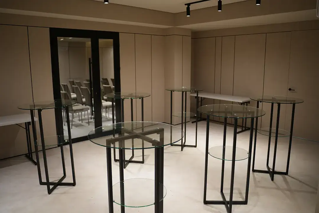 Зал дополнен просторным фойе, которое отлично подходит для кофе-брейков, коктейлей или небольших выставок. Современное аудио-визуальное оборудование и моторизованный экран создают все условия для успешного мероприятия, несмотря на отсутствие естественного освещения. Гостям предлагаются разнообразные варианты кофе-брейков и сытные обеды.