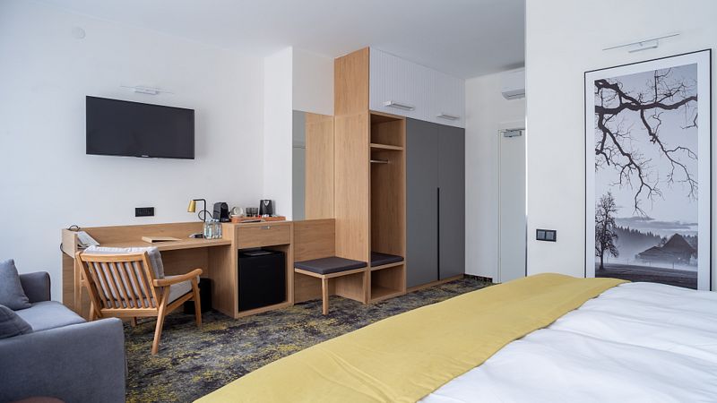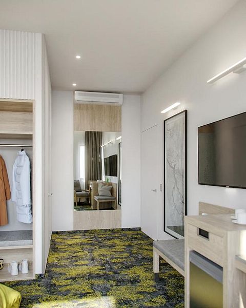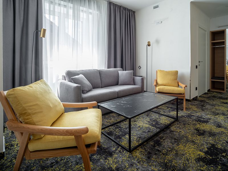 Люкс с видом на внутренний дворик. Оборудован всем необходимым для комфортного отдыха. Одно- и двухместные варианты размещения, с возможностью комфортного дополнительного места. Кровати с ортопедическими матрасами высотой 30 см. В номере чайная станция, капсульная кофемашина и бесплатный мини-бар.