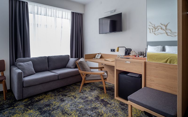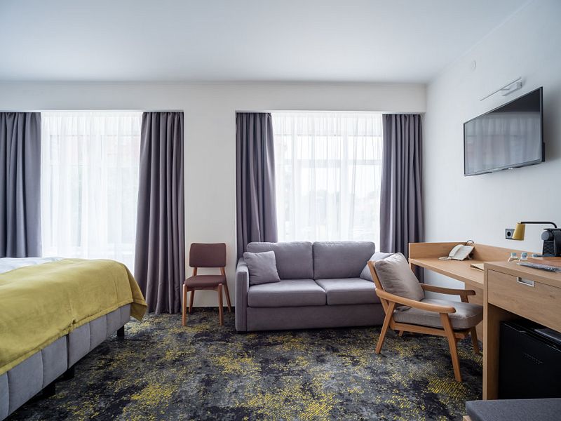 Просторный люкс с большой кроватью, рабочей зоной и уютным диваном. Вид на пешеходную улицу Старого города. В номере могут проживать до 4 гостей.Услуги и удобства