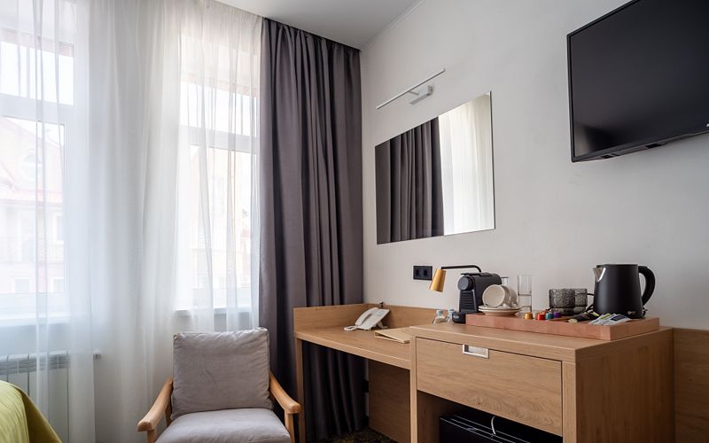 Комфортный номер с видом на внутренний тихий дворик. Современный дизайн номера в сочетании со всеми условиями высоко сервиса. Номер, оснащенный всем необходимым для отдыха и работы. Удобный ортопедический матрас высотой 30 см, позволит вам насладится комфортным сном. В номере комплиментарный мини барУслуги и удобства