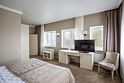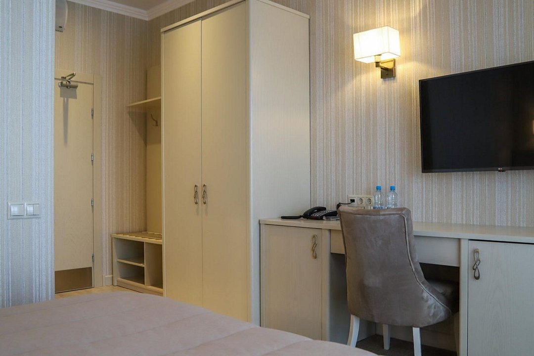 Комфортный номер выдержан в светлых и спокойных тонах. Оборудован всем необходимым для удобного размещения и приятного отдыха. Большая двуспальная кровать позволит расслабиться и отдохнуть после насыщенного. Для вашего удобства в номере есть мягкие стулья с письменным столом, платяной шкаф, доступ к бесплатному Wi-fi, холодильник, чайная станция и кондиционер.