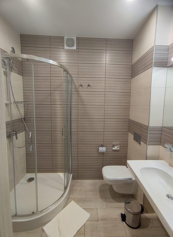 Ванная комната оборудована душевой кабиной, а также имеется фен и полный набор гигиенических средств.