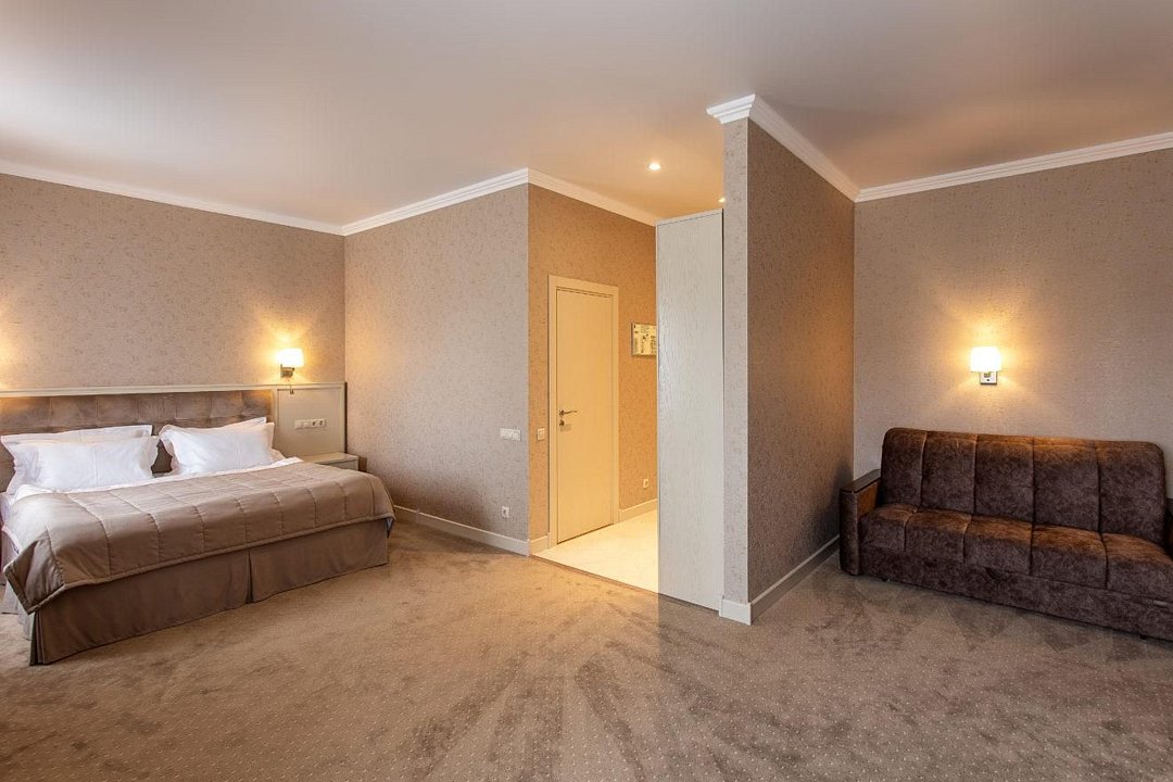 Представляем вашему вниманию просторный номер площадью 46 м2 с зонированием на две комнаты: спальню с большой двухместной кроватью и гостиную с мягким раскладным диваном с межкомнатной дверью, а также прихожей, расположенной между комнатами. Отличный вариант для комфортного размещения семьи из 4-х человек.