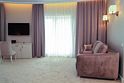 Номер отвечает всем современным требованиям комфорта. Он оснащен большой двуспальной кроватью King size, LСD-телевизором, письменным столом и мягким стулом. В гостиной расположен мягкий раскладной диван. В прихожей для вашего удобства имеется платяной шкаф. Так же в номере есть комод с зеркалом, доступен бесплатный Wi-fi, чайная станция и кондиционер. Из окна открывается вид на окрестности поселка.
