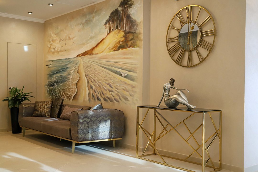 Дизайн интерьера выдержан в теплых пастельных тонах.