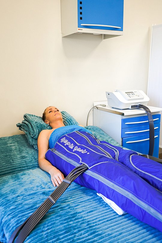 Лимфодренажный массаж (прессотерапия) — процедура, направленная на стимуляцию работы лимфатической системы и облегчение движения жидкости в организме. Ускорение лимфотока способствует освобождению клеток и тканей от токсинов. Суть прессотерапии сводится к давлению на определенные участки тела сжатым воздухом. Массаж стимулирует венозный и лимфатический поток и как следствие — из тканей выводятся токсины и застоявшаяся жидкость, нормализируется водный и кислородный обмен на клеточном уровне, увеличивает поступление крови к коже, что способствует улучшению регенерации, стимулирует и тонизирует мышцы и суставы, за счет чего тело расслабляется, устраняются спазмы. Массаж стимулирует нервные окончания, снимает стресс и напряжение, способствует хорошему самочувствию. Процедура безболезненна, но при этом достаточно эффективна для удаления лишнего веса за счет вывода накопившейся жидкости.