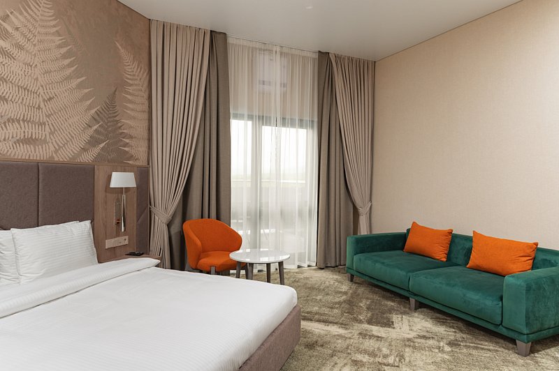 Номер предлагает исключительный комфорт для гостя. Оснащен просторной спальней, интерьер дополнен диваном и просторной зоной отдыха.