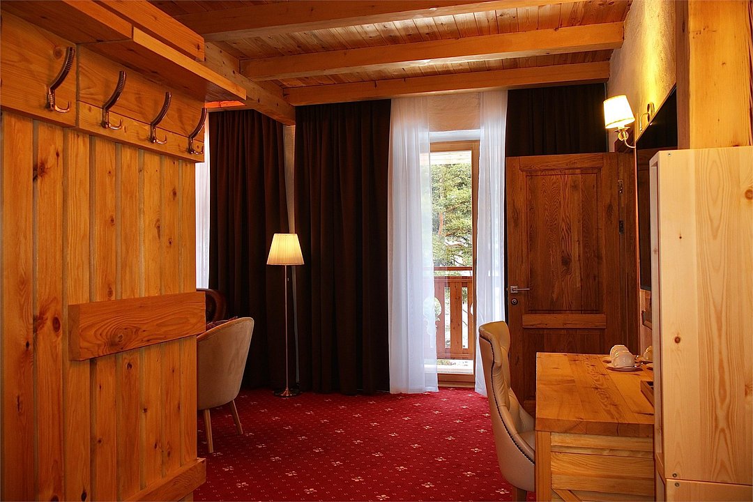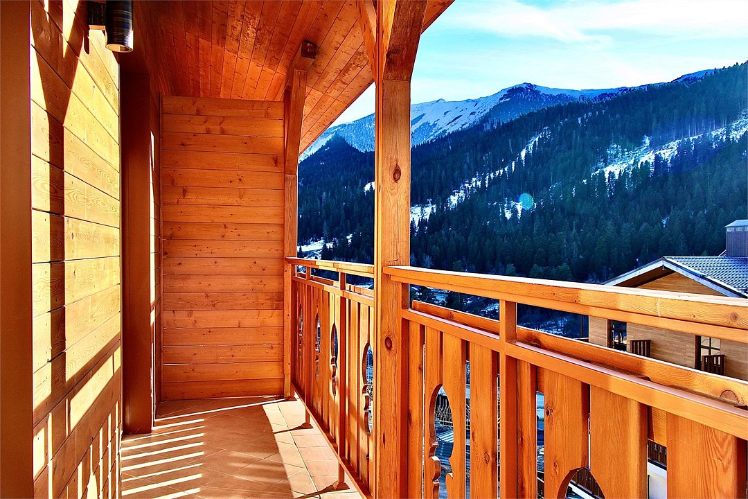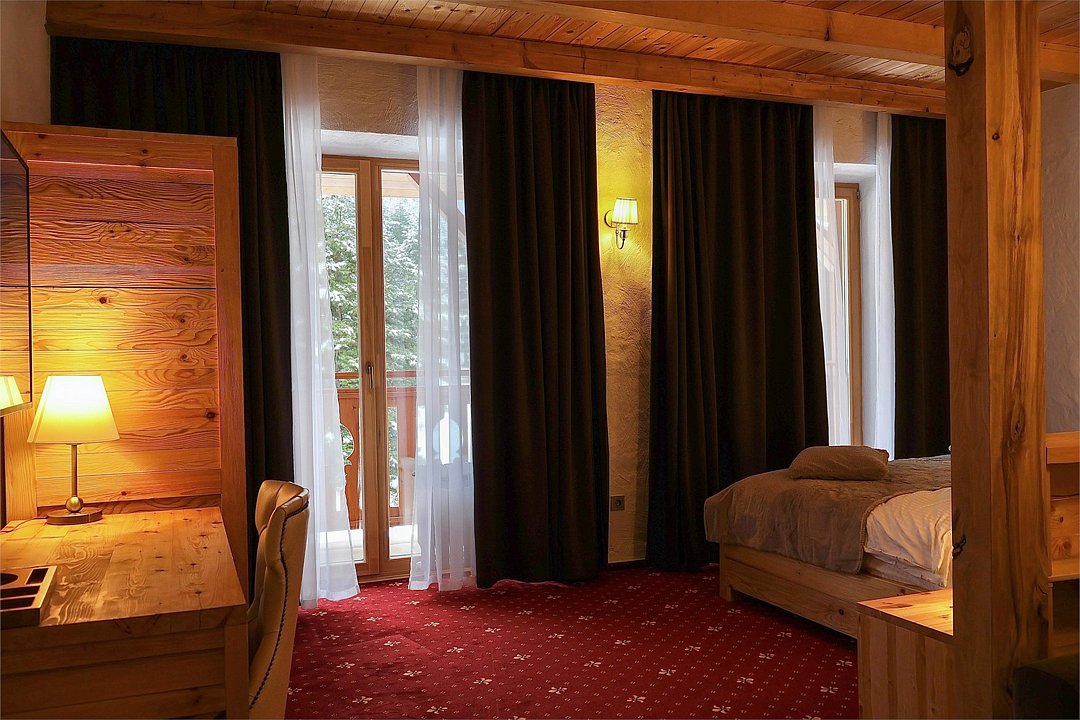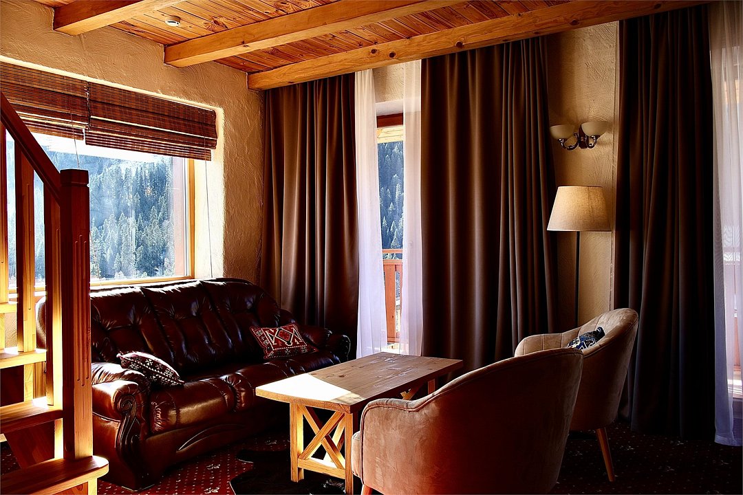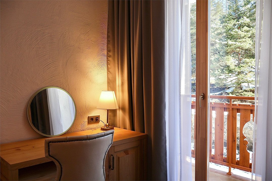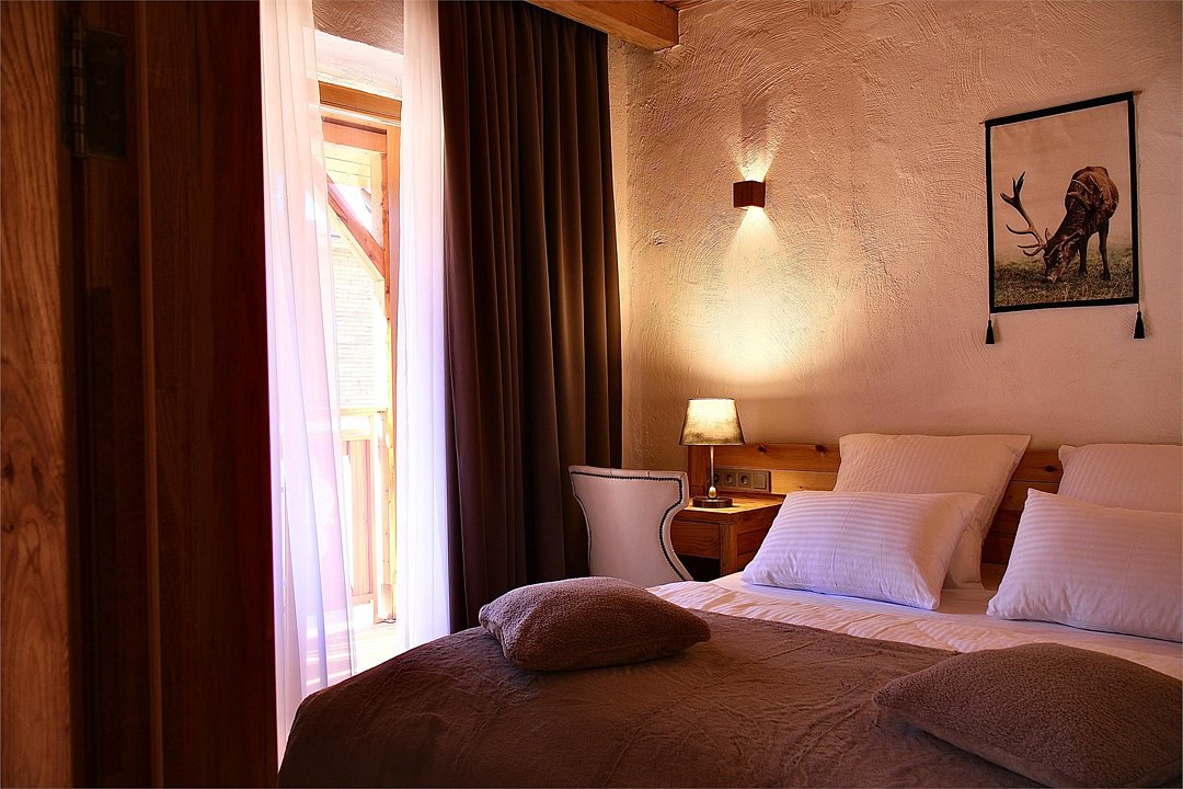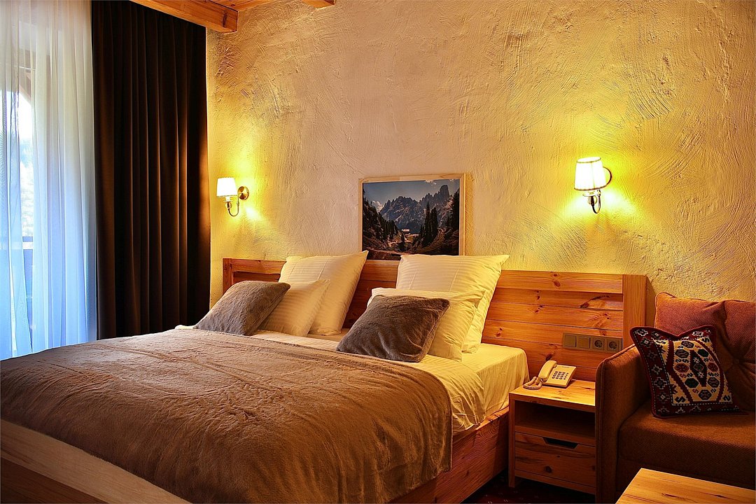 Отель выполнен в альпийском стиле с использованием исключительно натуральных материалов для создания атмосферы теплоты и уюта.