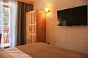 Однокомнатный номер для размещения четырех человек на основных местах и еще одного на дополнительном. Теплые тона интерьера позволят согреться после насыщенного горнолыжного отдыха.