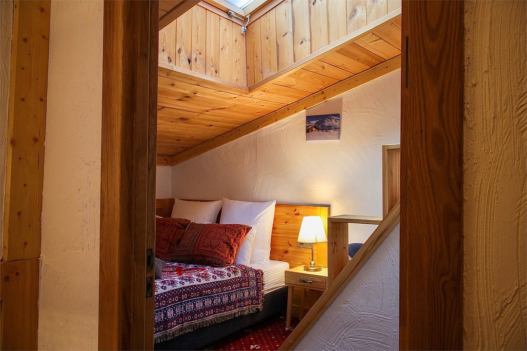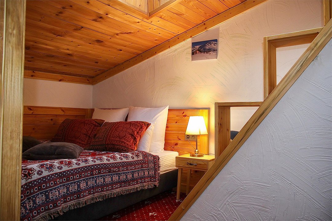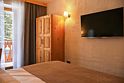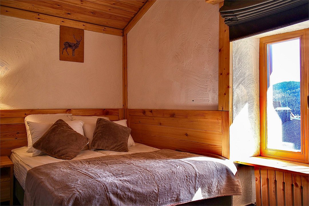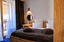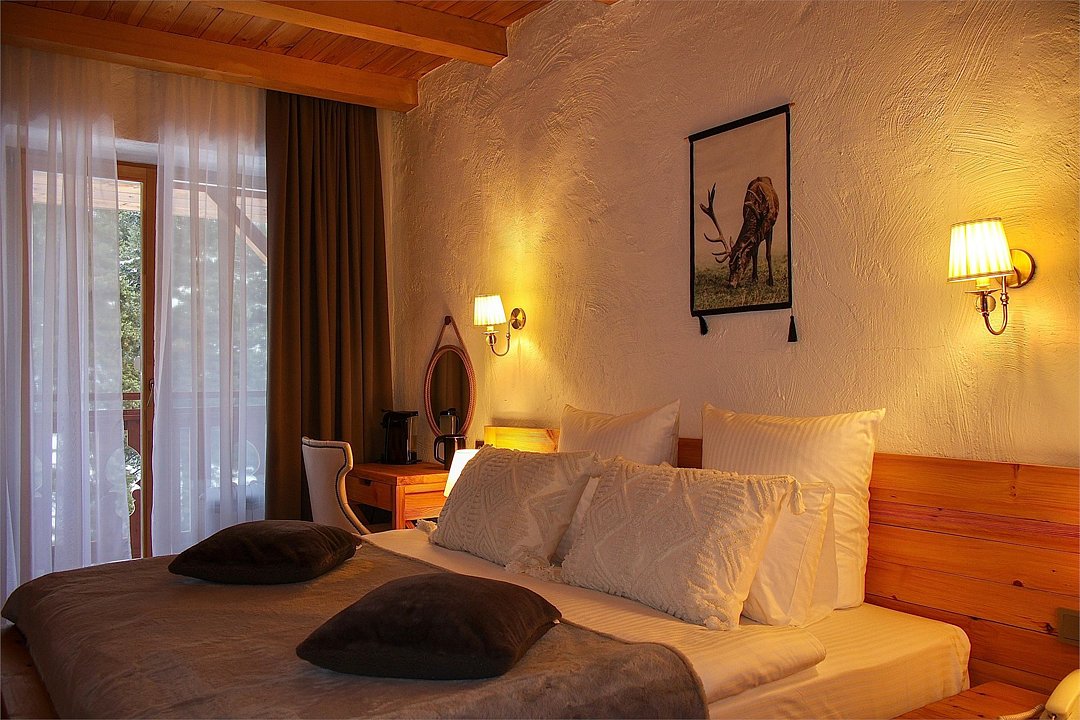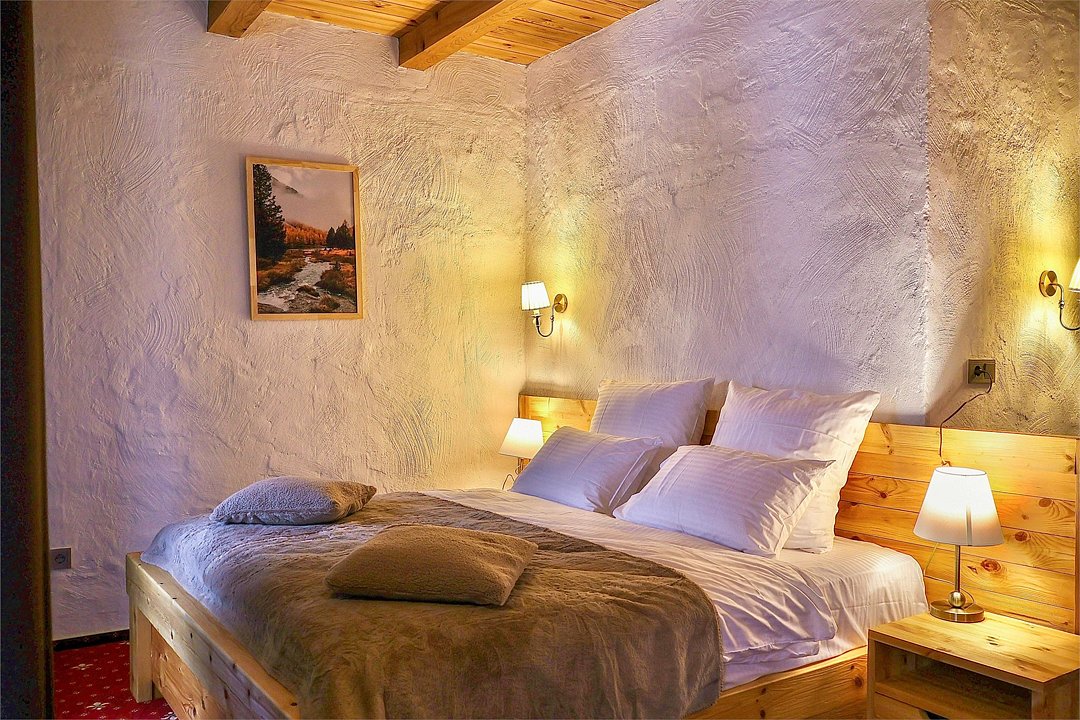 Однокомнатный номер с двуспальной кроватью подходит для размещения двух гостей. Интерьер номера выполнен из натуральных материалов в альпийском стиле. Деревянные окна в пол и красивый вид из номера создают атмосферу уюта.