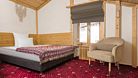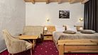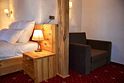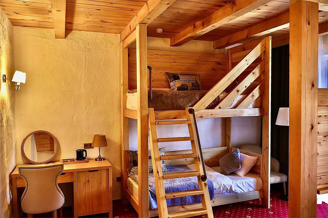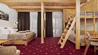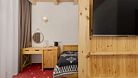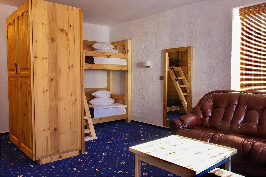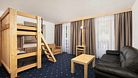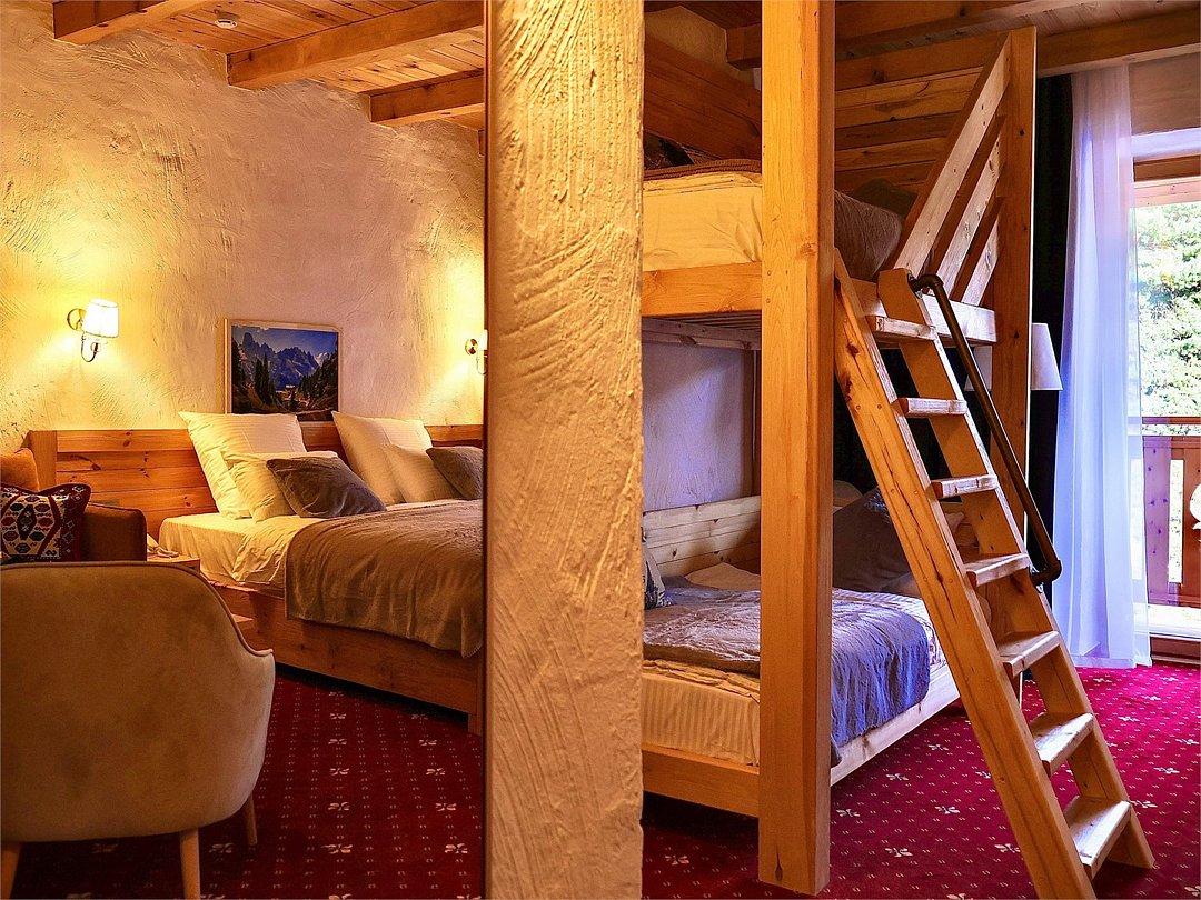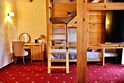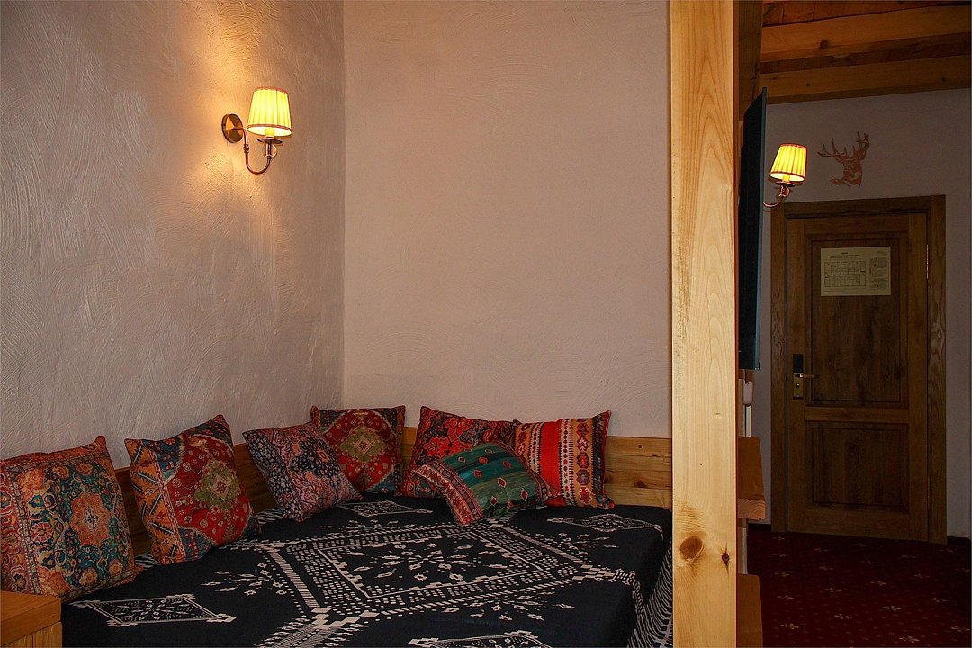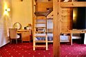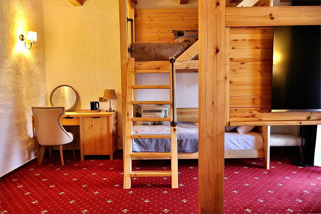 Двухкомнатный номер для четырех человек на основных местах и еще одного на дополнительном. Здесь будет уютно и комфортно даже большой семье. Альпийский интерьер позволит забыть о городской суете и погрузиться в атмосферу горнолыжного курорта.