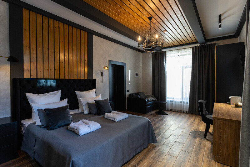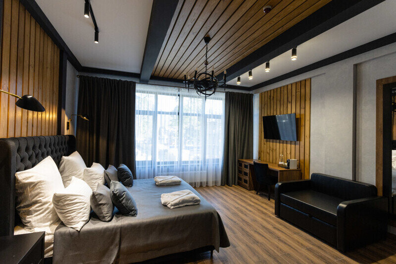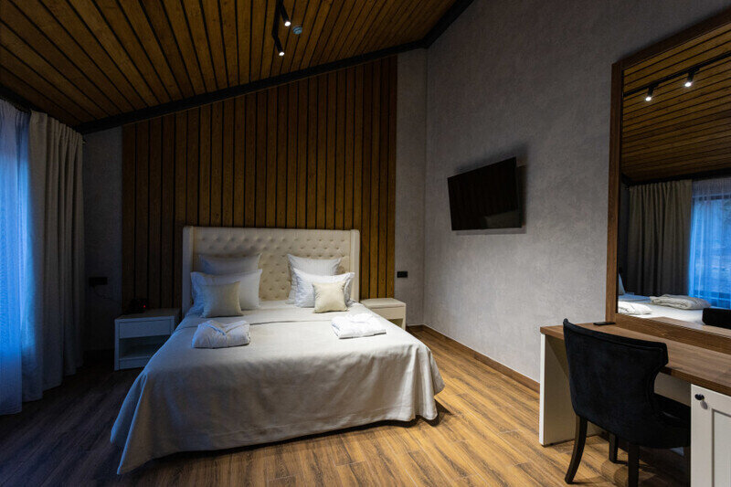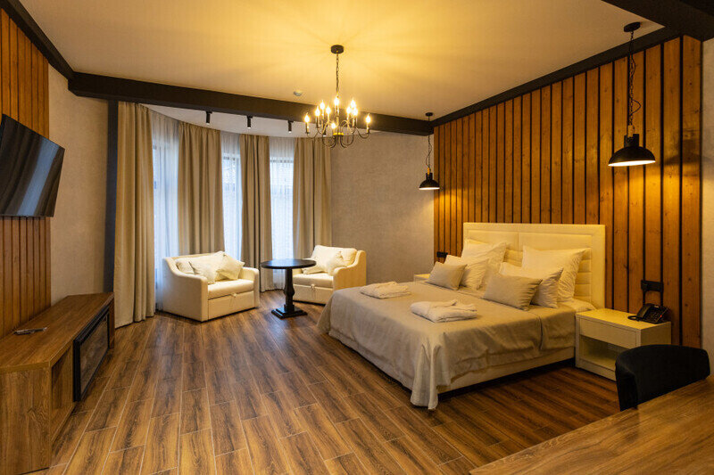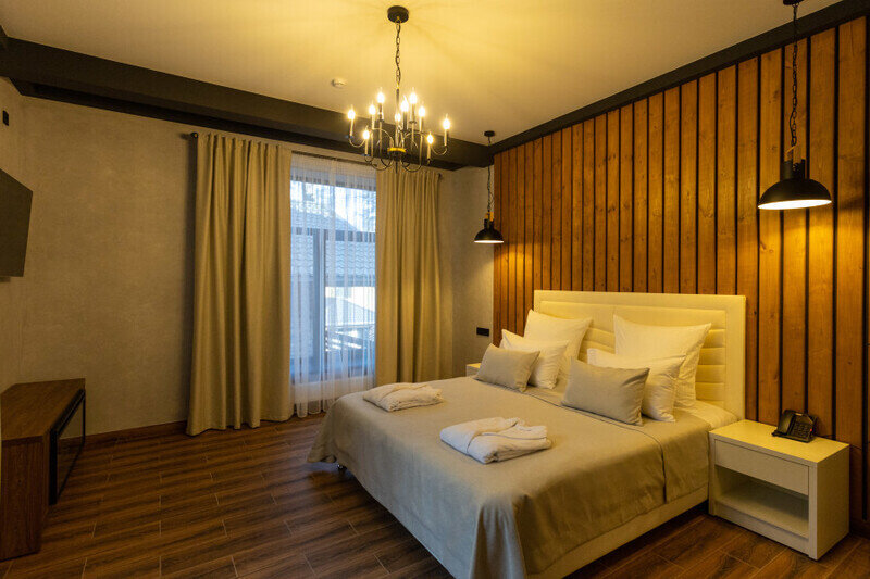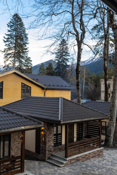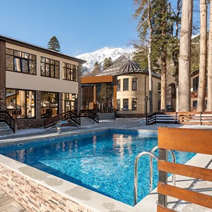 1. Отель имеет уникальную современную архитектуру, новый и современный. На территории отеля несколько жилых корпусов, ресторан, открытый теплый бассейн, хамам и баня (последнее платные после 16.00).
