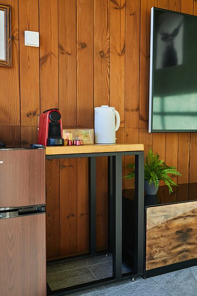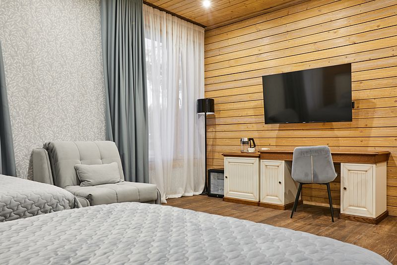Прекрасный трехместный номер с высококлассным дизайнерским ремонтом и дорогой эксклюзивной мебелью, с двумя односпальными кроватями и раскладным диваном, панорамными окнами и волшебным видом на озеро.