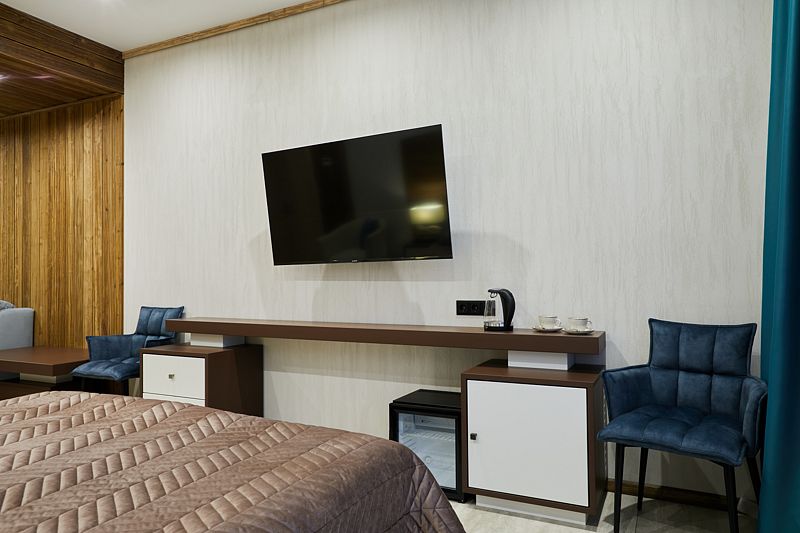 Шторы блэкаут создадут полную темноту даже во время «белых ночей». А огромный телевизор с диагональю 55 дюймов и функцией Смарт ТВ скрасит ваш досуг, если захочется просто поваляться в постели. В номере есть мини холодильник, электрочайник и столовые приборы.