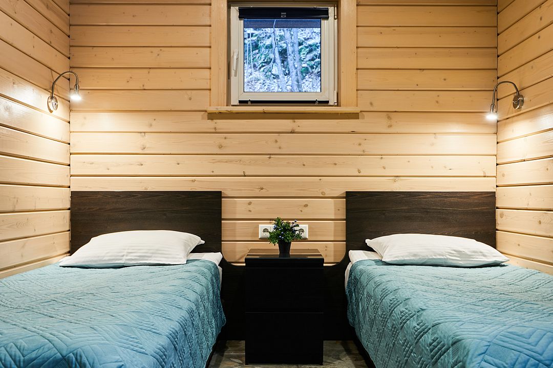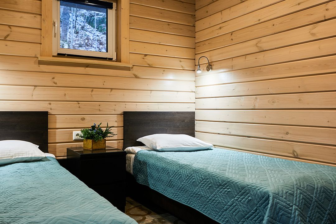 Просторный двухместный номер с высококлассным дизайнерским ремонтом и дорогой эксклюзивной мебелью, с двумя односпальными кроватями, панорамными окнами и волшебным видом на озеро.