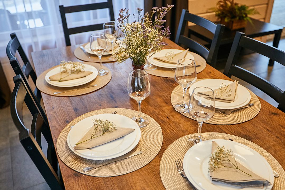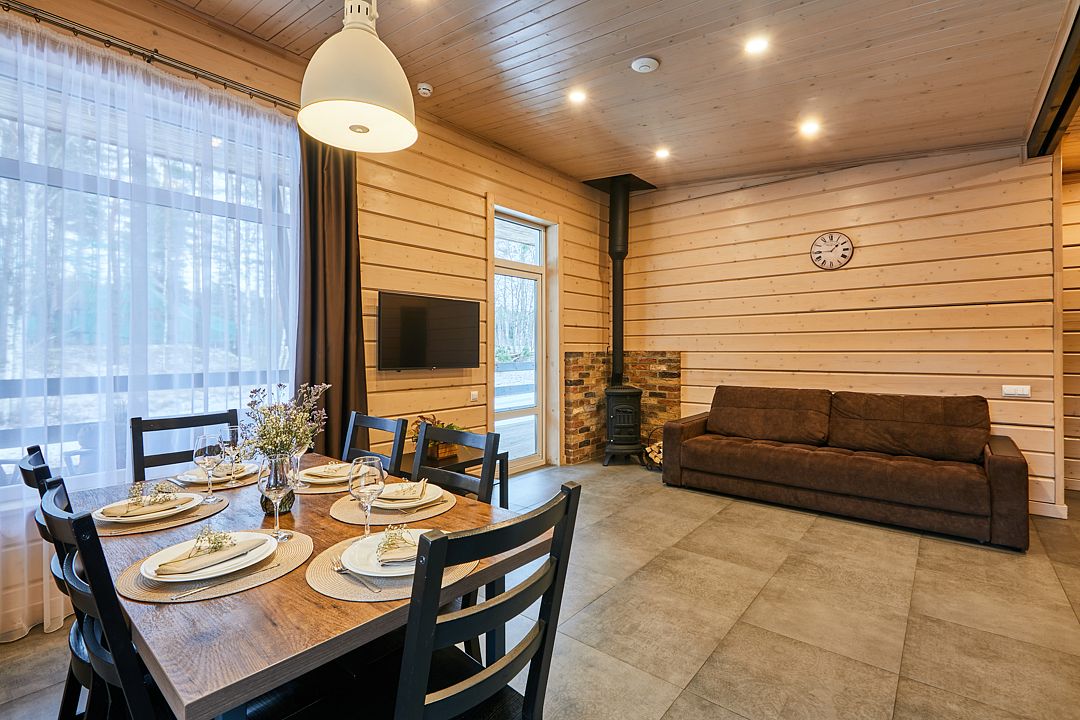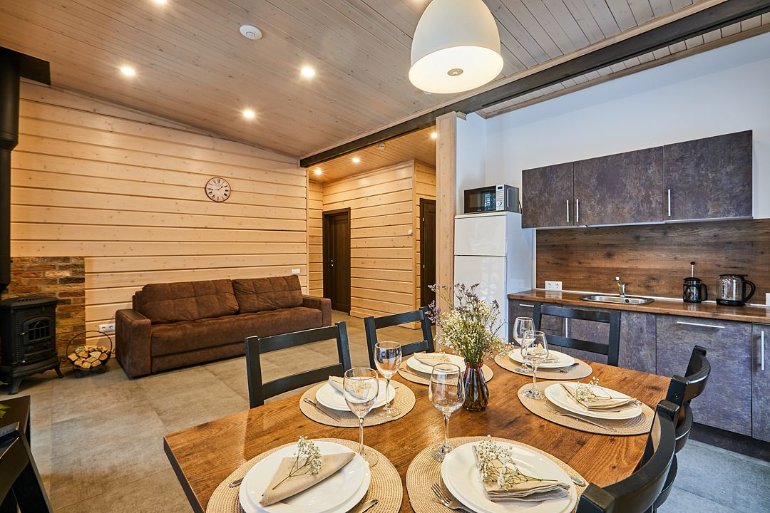 Кухня оборудована всем необходимым для приготовления еды. Есть посуда, бокалы для различных напитков, холодильник, плита, микроволновая печь, электрический чайник, также имеется посудомоечная машина. За большим обеденным столом в гостиной может комфортно разместиться 8 человек, а камин не только поможет согреться в зимние вечера, но и создаст неповторимый уют.