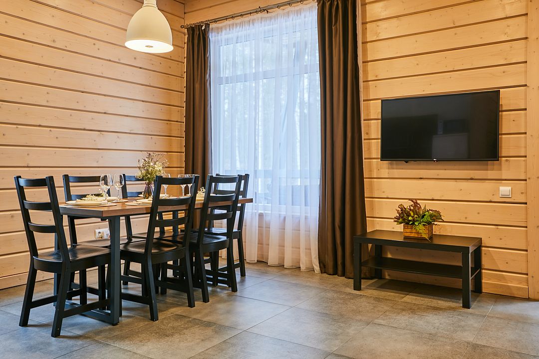 Кухня оборудована всем необходимым для приготовления еды. Есть посуда, бокалы для различных напитков, холодильник, плита, микроволновая печь, электрический чайник, также имеется посудомоечная машина. За большим обеденным столом в гостиной может комфортно разместиться 6 человек, а камин не только поможет согреться в зимние вечера, но и создаст неповторимый уют. В гостиной поможет скрасить досуг телевизор с большой диагональю и функцией Смарт ТВ. На террасе можно приятно провести время с чашечкой чая или бокалом вина, расположившись в удобных ратанговых креслах. При желании постирать в вашем распоряжении имеется стиральная машина . В коттедже есть финская сауна. На мангале можно пожарить мясо или рыбу, уголь и розжиг предоставляется по запросу. Прямо в номер можно заказать еду из ресторана "Иван чай". Банные полотенца, тапочки, гели, шампуни и зубные наборы бесплатно в вашем распоряжении.