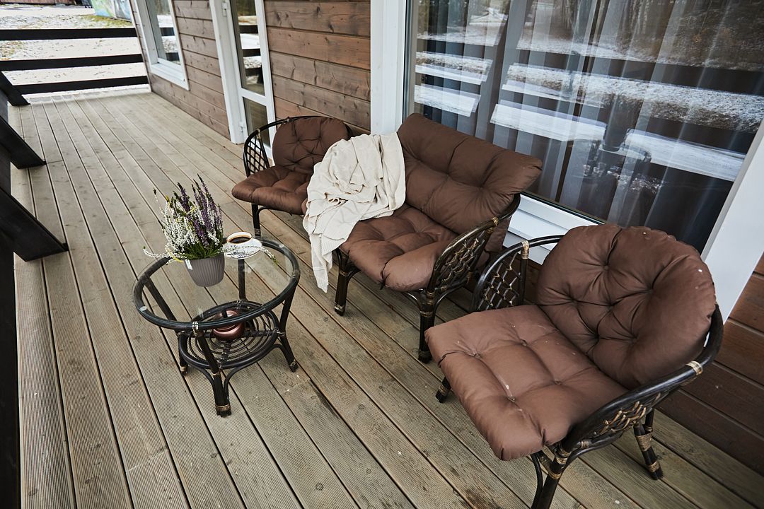 На террасе можно приятно провести время с чашечкой чая или бокалом вина, расположившись в удобных ротанговых креслах. При желании постирать в вашем распоряжении имеется стиральная машина. На мангале можно пожарить мясо или рыбу, уголь и розжиг предоставляется по запросу.