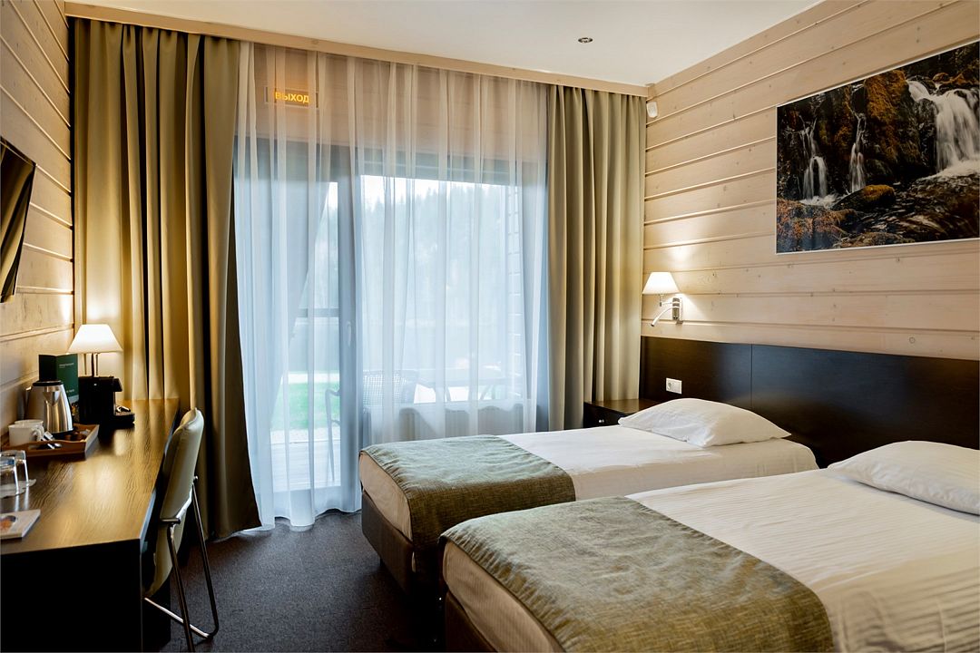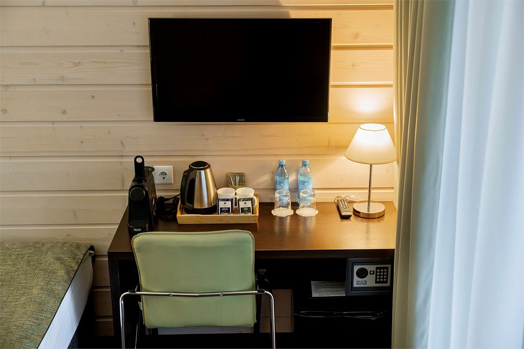 май 2023 г.Уединенное место для отдыха вдвоемОтличный отель, тихий, уютный, красивая территория и домики с номерами. Чувствуется единение с природой, отдыхаешь от городской суеты. Имейте в виду, что ресторан находится в 10 минутах пешком через лесную тропу, либо две минуты на машине надо проехать работает до 21:00 (алкоголь фри), утром завтрак там же. Завтрак очень хороший! Как ресторан работают в формате столовой-шведского стола. Персонал приветливый в отеле. Зона ресепшн-лаунж зона - невзрачная и не уютная, здесь вот можно было доработать: просто столы и стулья обычные. Не располагает посидеть, пообщаться. Есть игры настольные. Наверное, здесь все же формат провести время вечером в номере или на природе, нежели в лобби. В целом отличное место для выходных!