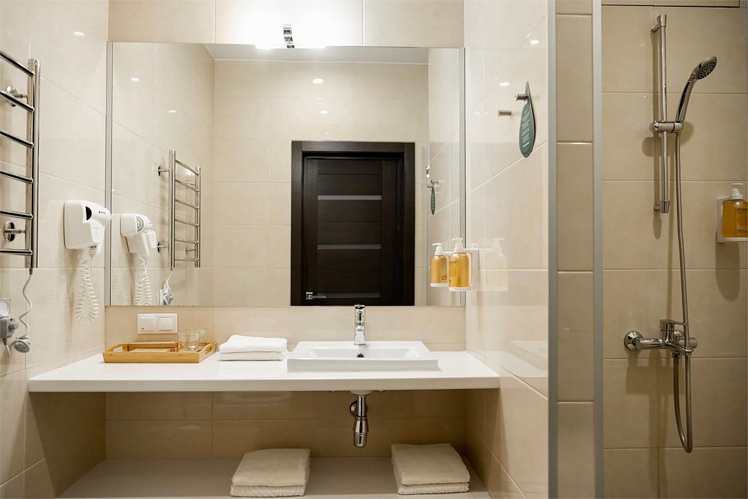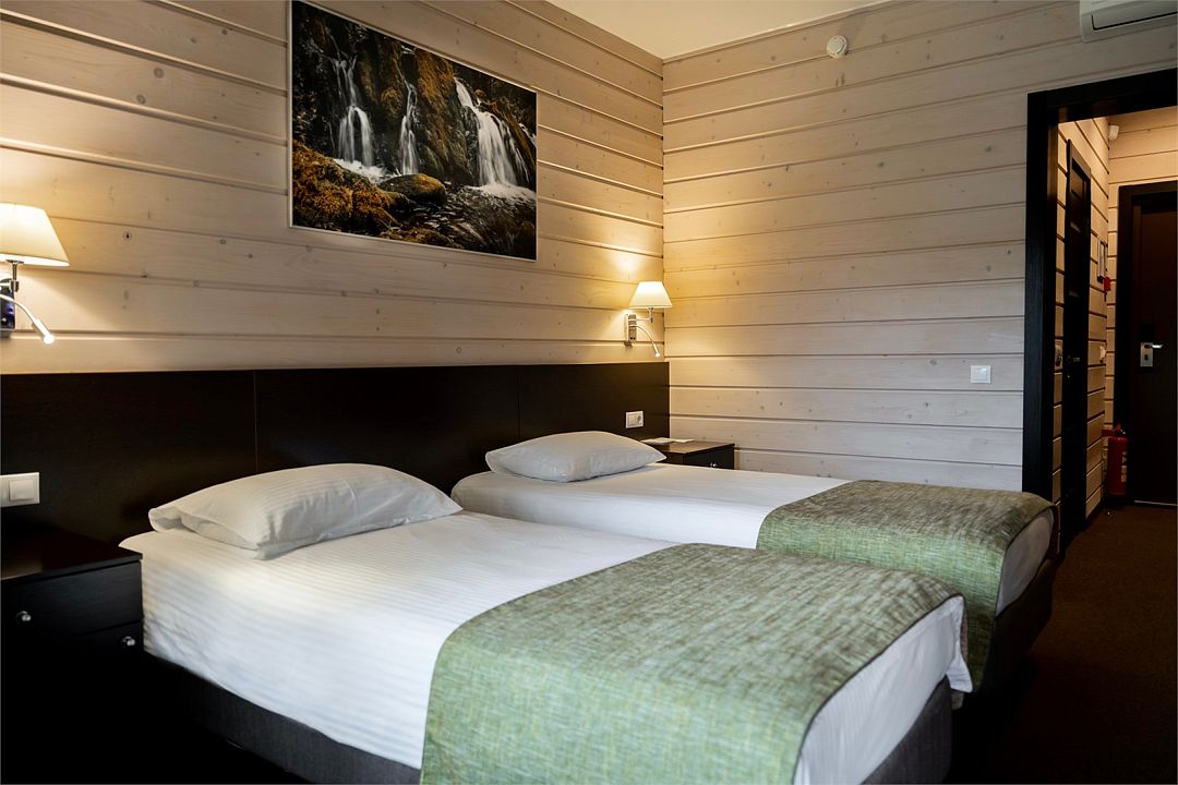 В каждом номере вы найдете все современные удобства. Никакого намека на роскошь, только то, что нужно для действительно комфортного проживания: удобная мебель, две односпальные кровати, просторная ванная комната с душевой кабиной, полотенцами и феном, телевизор, персональный сейф.