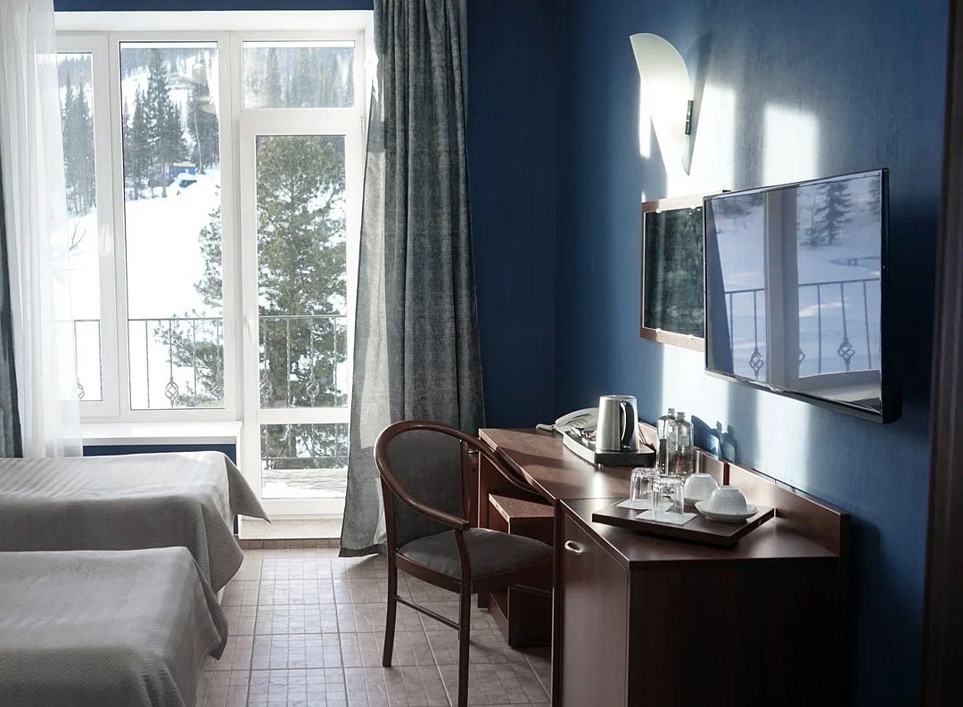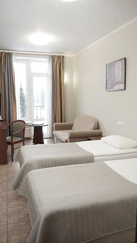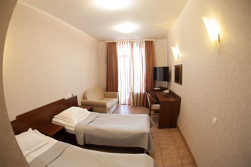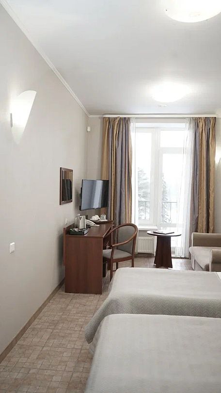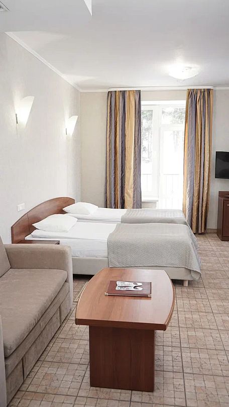 В номере представлены 2 раздельные кровати (90 на 200 см). Просторный номер повышенной комфортности. Идеально подойдет для семейного отдыха с детьми или для небольшой компании. В качестве дополнительных мест в номере есть раскладной диван. Номер состоит из спальни, прихожей, ванной комнаты и балкона с красивым видом.