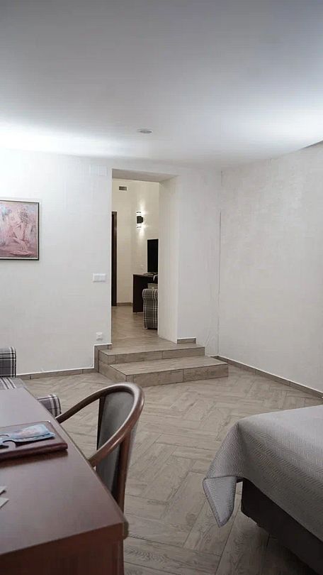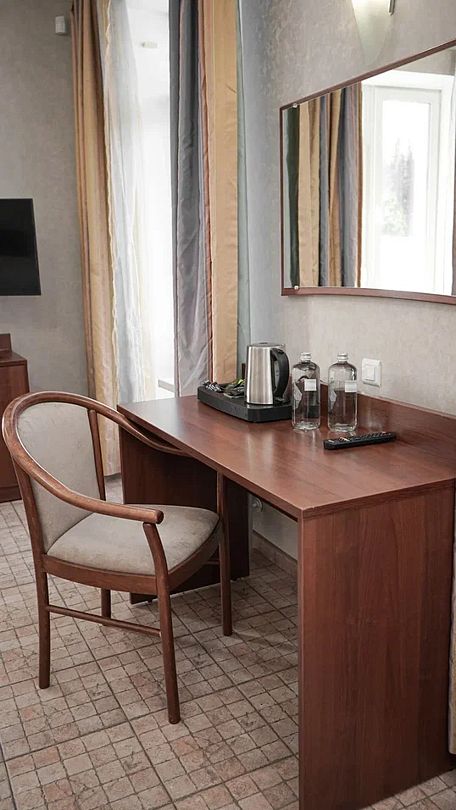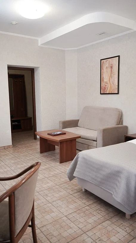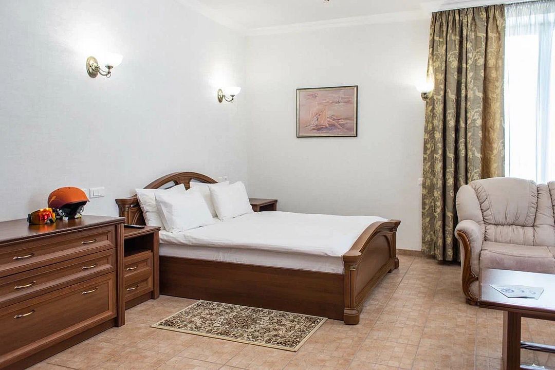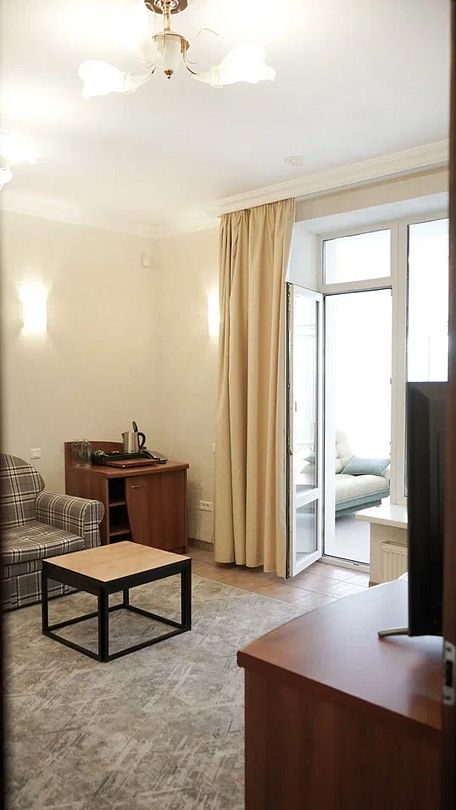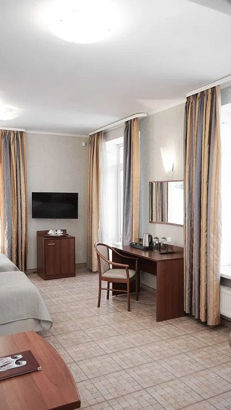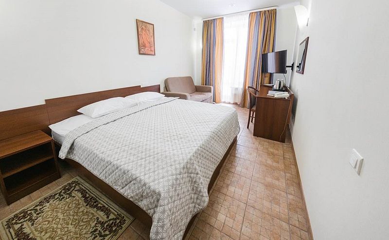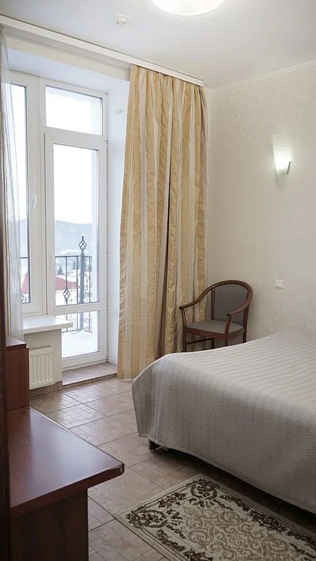 Уютный однокомнатный номер для двух гостей. Номер состоит из спальни, прихожей, ванной комнаты и балкона с красивым видом. Интерьер номера выполнен в спокойных бежево-коричневых тонах в классическом стиле. Прекрасный вариант для отдыха вдвоем.