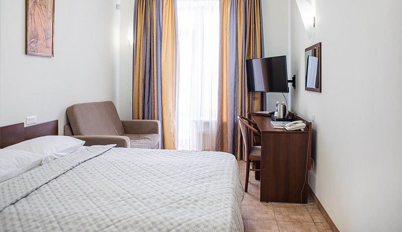 Данный номер является экономичным решением, как для нескольких Гостей, так и для большой компании. Номер расположен в мансардной части отеля (5 этаж). Важно! в номере не открывается окно.