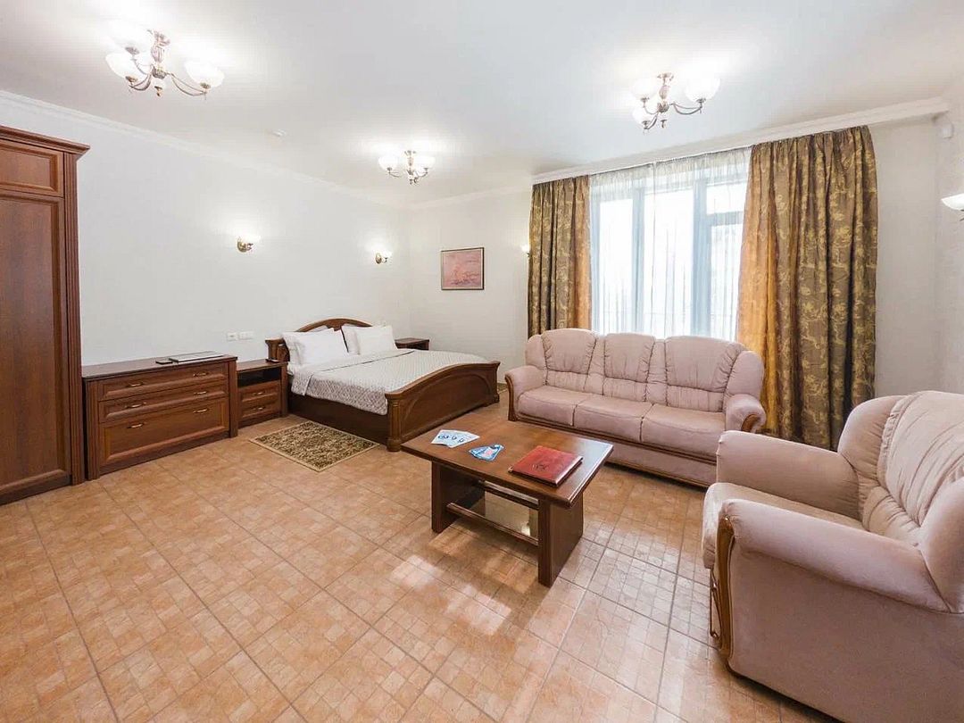 Преимуществом номеров категории «Студия+» является увеличенная площадь номера до 50 кв.м., классическая планировка с достаточно свободным пространством для удобного размещения. Подобранный интерьер создает атмосферу уюта и комфорта для беспечного отдыха после активного дня. Номер состоит из спальни, гостиной зоны и ванной комнаты. Дополнительные места в номере: раскладной диван и кресло.