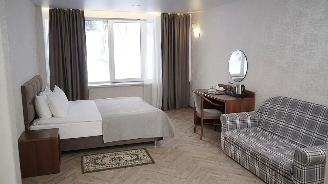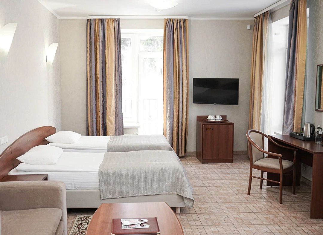 В номере представлено: две полутороспальные кровати или одна двуспальная кровать, диван-кровать.