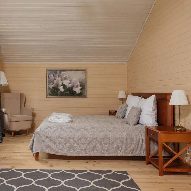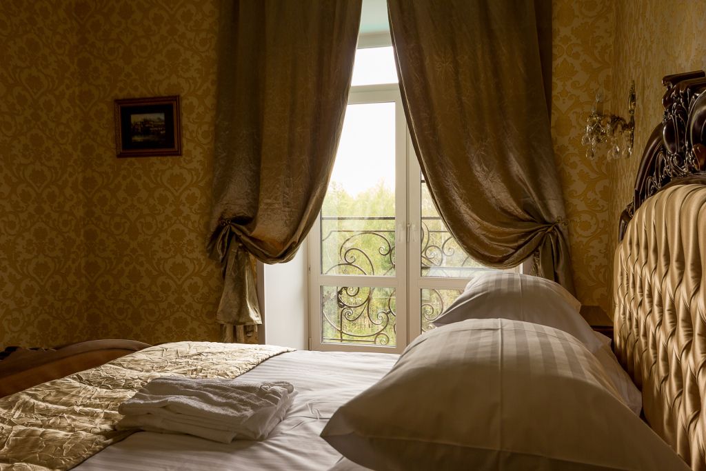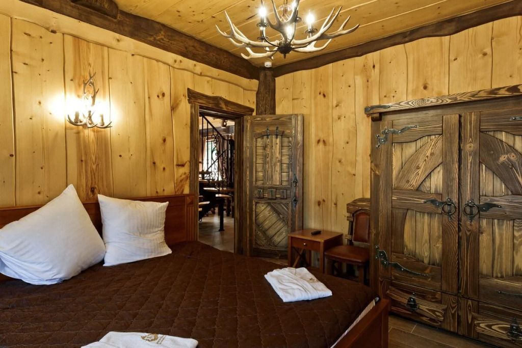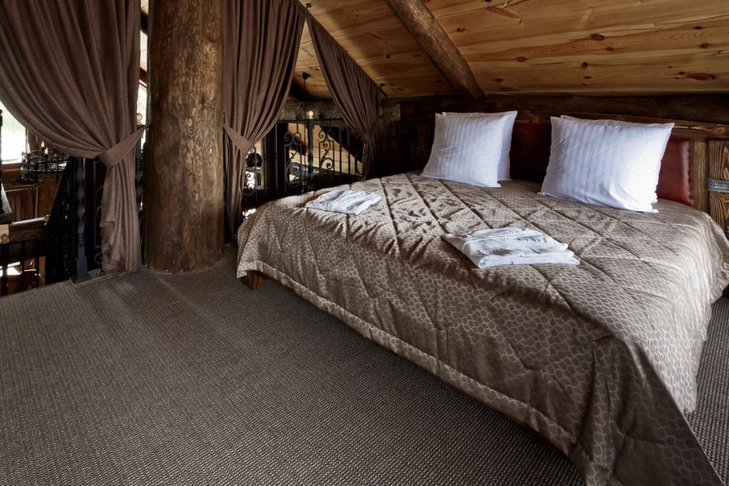 Вторую ночь нам предстояло встретить в охотничем домике, просторный номер встретил нас высокими потолками, массивной мебелью и такими же масивными предметами интерьера, а так же просто гиганским телевизором с диагональю 70+. из плюсов номера это его размер, близость к главному зданию и к зверинцам, очень запомнился енот, козленок, олени и кролики. Крики павлинов будто переносят в субтропики.... Из минусов, это отсутствие красивых видов из окон(номер 24) и хорошая слышимость соседей через дверь-портал, но длилось наше прибывание в здесь не долго, ближе к вечеру начался ливень стеной, и по нашему возвращению в номер обнаружили течь с потолка в ванной комнате, очень грустно что не повезло с исполнителями кровельных работ, и такой красивый ремонт страдает, звонок администратору, и мы переезжаем в vip-номер, с порога погружаясь в атмосферу комфорта и стиля рококо, отдельная гардеробная, большая ванная комната с джакузи и выход к бассейну из номера, всё это оставило у нас только самые приятные воспоминания. К сожалению до открытия бассейна на улице оставалось несколько дней, компенсировали это купанием в закрытом бассейне и походами в сауну и джакузи. На удивление быстро прогрелась вода в реке Покша, купались в своё удовольствие, но душ на пляже работал только во время работы бара, как и туалет, и это большой такой минус, как и не было качелей, на каркасе висели только цепи, а так хотелось покачаться и сделать памятные фото, хочеться верить, что это всё из-за начала сезона...