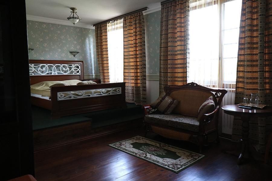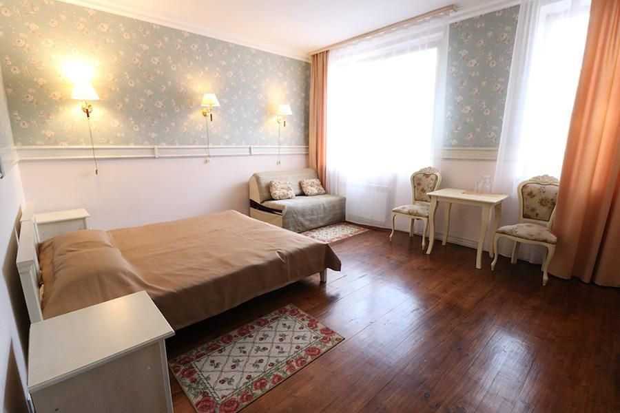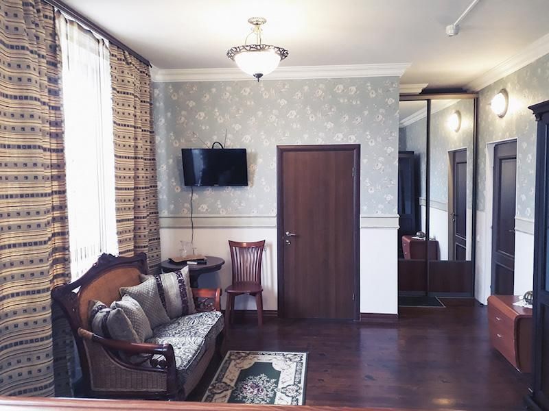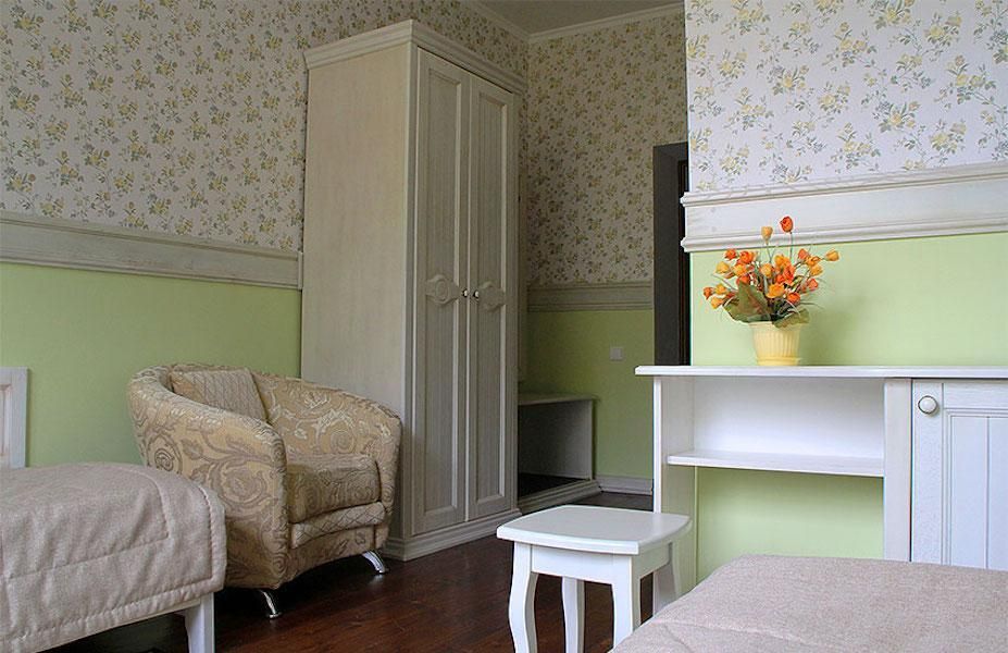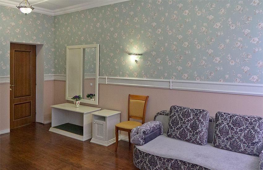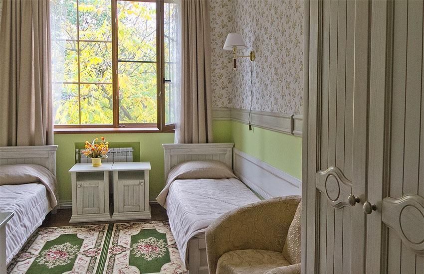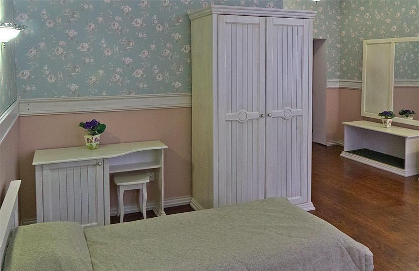 Просторные номера площадью от 20 до 25 кв.м. Возможно размещение в номерах с двумя односпальными кроватями или одной двуспальной кроватью. В каждом номере шкаф, письменный стол, стулья, душ, халат, тапочки и средства гигиены. В каждом номере есть раскладной двуспальный диван.