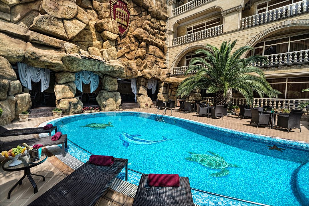 Путешествие по работеПродуманный отель имени себяЛокация конечно такая себе, до моря минут 20 пешком, правда трансфер есть; в шаговой доступности никакой Магнит ну и хорошая Алкотека, зато несколько неплохих ресторанов. Много гостей на авто, преимущественно из "суровых" регионов - Тюмень, Челябинск, Новосибирск. Охраняемая территория, на ночь ворота закрывают, охрана бдит, и загулявший допоздна постоялец вернётся без проблем. Классический недешёвый интерьер, в коридорах дорогие ковры, ампирный говорящий как в метро неспешный лифт. Изумительные девушки на ресепшн. В огромных номерах делюкс основательная деревянная мебель, тоже ковры, высокого качества гигиенические принадлежности, халаты и тапочки, холодильник, чайная станция. Уборка каждый день - идеально, полотенца свежие, вода, бельё без проблем. Убирают в номерах и на кухне сотрудницы из БСССР но с хорошим знанием языка и видимо воспитанием. Мощные пасторальные завтраки: пельмени, вареники, плов, другие вторые блюда, несколько видов сосисок и сарделек, гарниров, и вегетарианских капуст типа брокколи; море фруктов и десертов, отменный кофе, по выходным очень хороший брют от души. Небольшой уютный подогреваемый бассейн, стильные и качественные бордовые полотенца для него и пляжа. Всё отлично, культ личности и традиций, - как уместная изюминка, и ещё раз респект сотрудницам ресепшн!