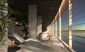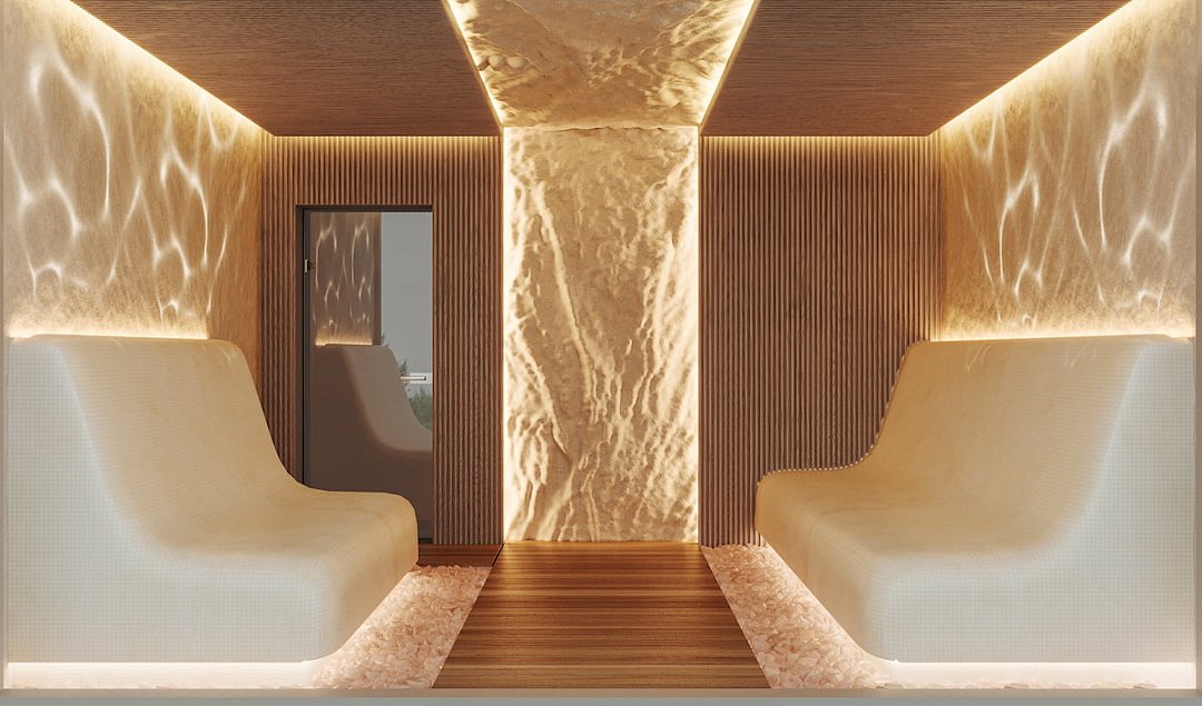 Погружение в мягкое тепло и соляной микроклимат с прямым видом на море. Полупрозрачные соляные панели и тёплая подсветка создают спокойную атмосферу, а длинные анатомические лежаки позволяют расслабиться и восстановить дыхание в комфортном режиме.