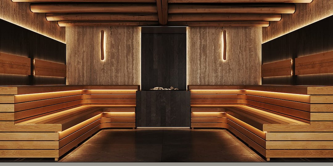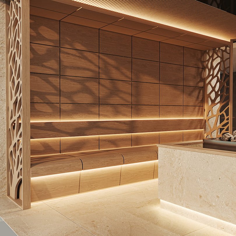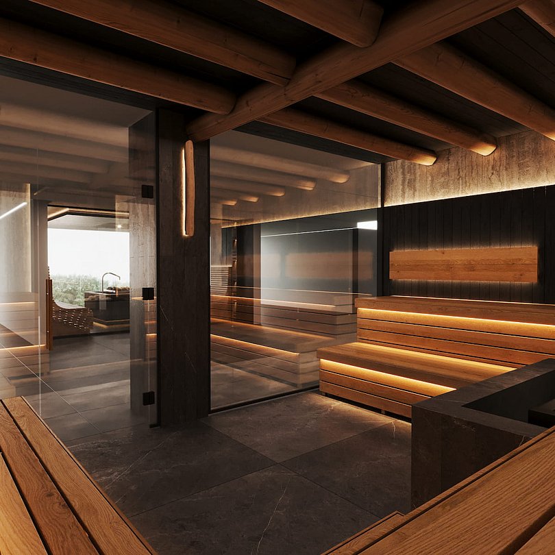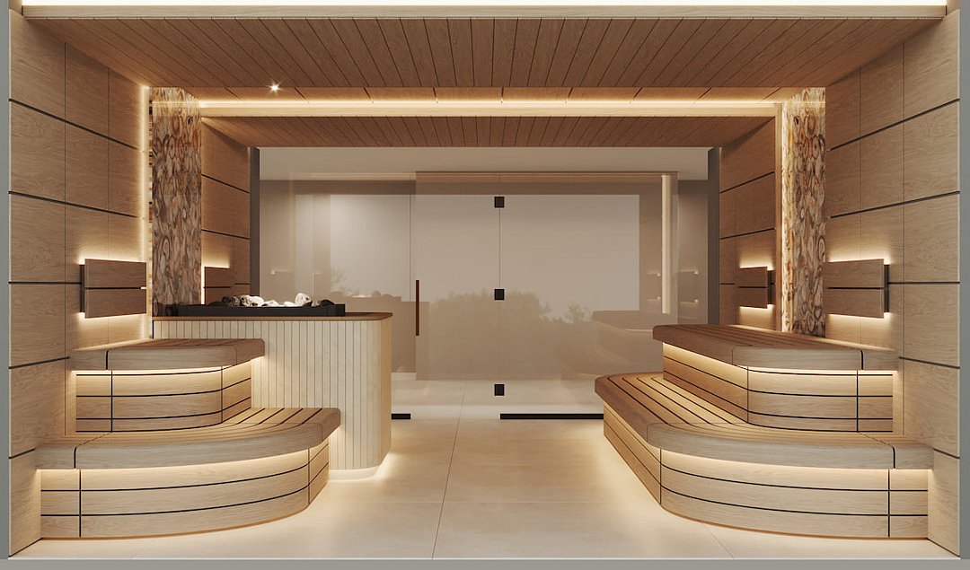 Влажный жар, каменка с раскалёнными камнями и тёплые деревянные лежаки создают густой, «обволакивающий» пар. Мягкая подсветка и природные фактуры настраивают на медленный ритуал прогрева — идеальный этап перед процедурой или после бассейна.