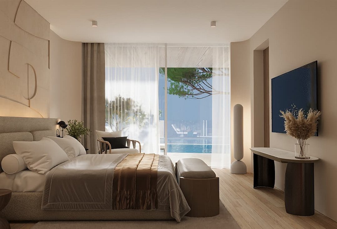 Двухкомнатный сьют с собственной террасой и индивидуальным бассейном — формат уединённой резиденции на первой линии. С террасы открывается прямой вид на море; зона шезлонгов и обеденная группа создают идеальное место для солнечных завтраков и ужинов на за