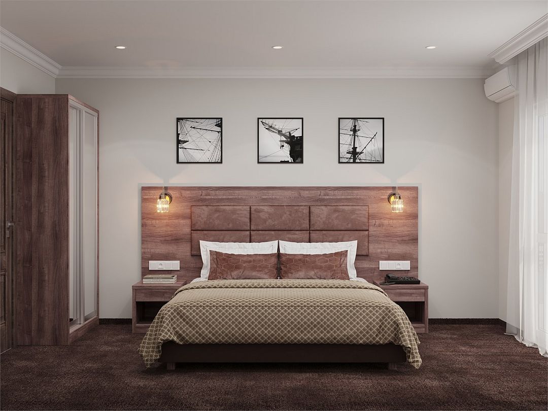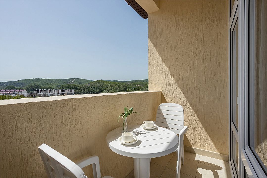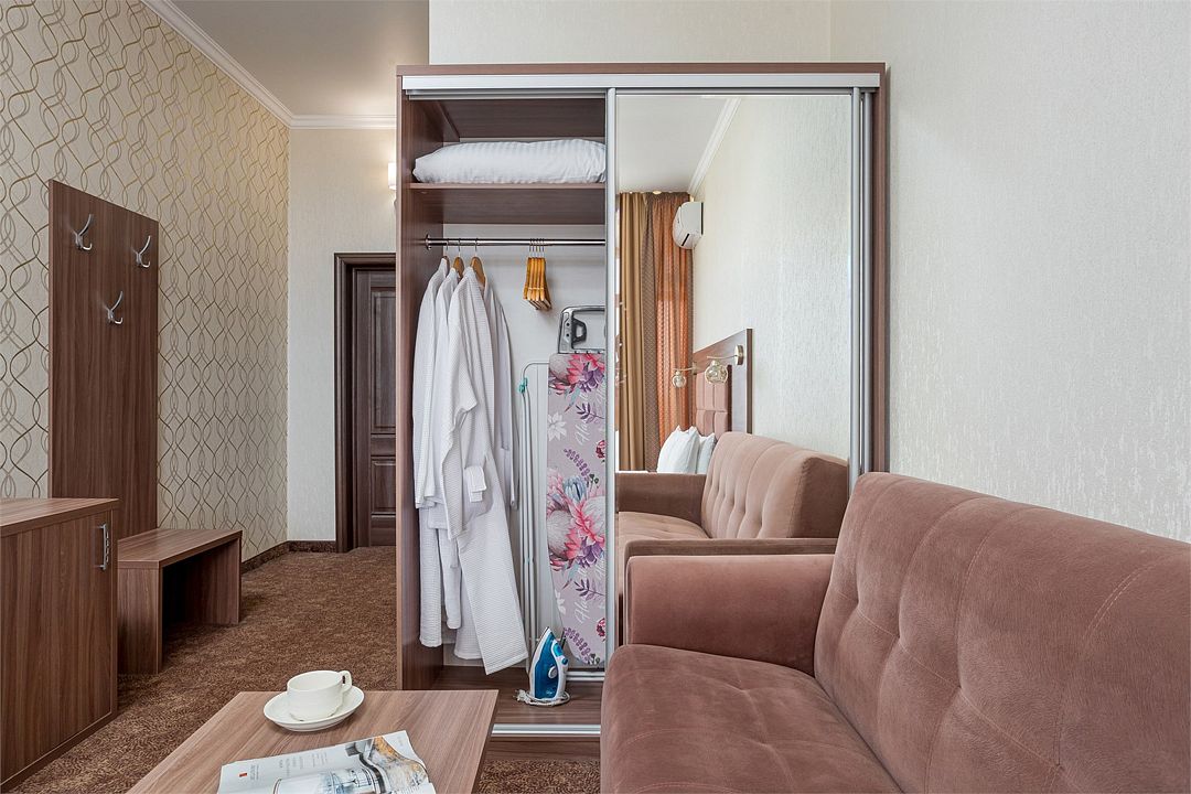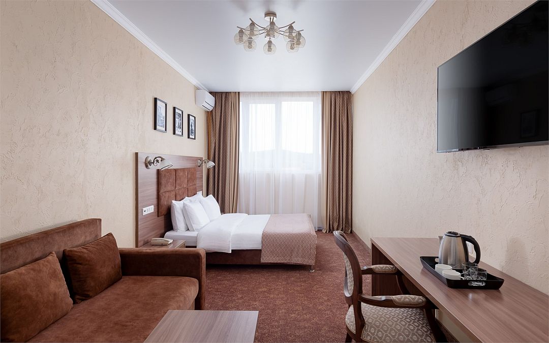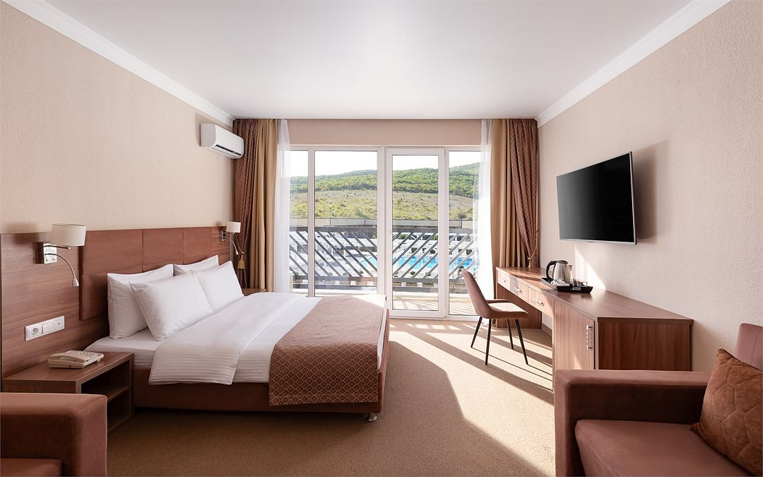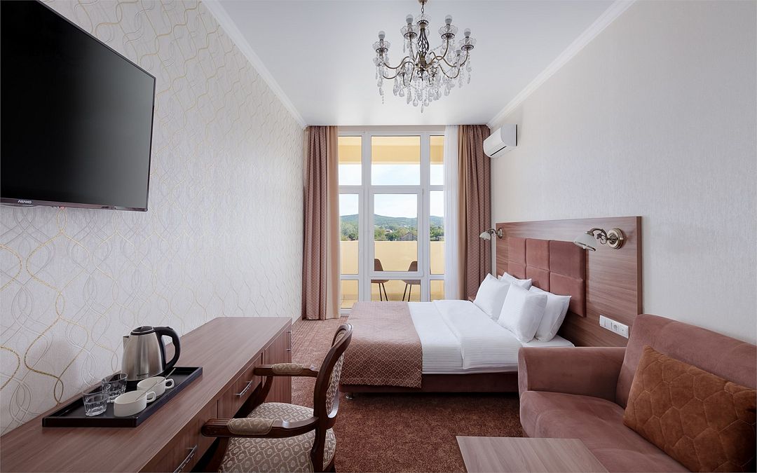 Просторные номера повышенного комфорта в приятном дизайне из тёплых тонов. С балкона открывается прекрасный вид на окрестности поселка Сукко. В номере располагается большая двуспальная кровать, раскладной диван, и ванная комната, оборудованная всем необходимым. Номер предусмотрен для проживания из трёх взрослых или семьи из четырёх человек.Услуги и удобства