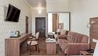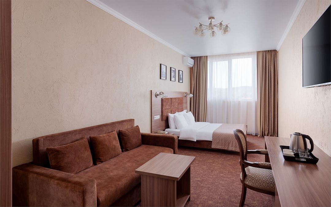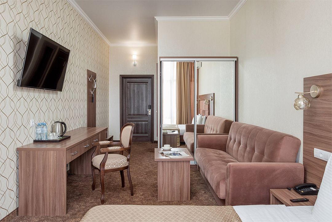 Просторные номера повышенного комфорта в приятном дизайне из тёплых тонов. В номере располагается большая двуспальная кровать, раскладной диван, и ванная комната, оборудованная всем необходимым. Номер предусмотрен для проживания из трёх взрослых или семьи из четырёх человек.Услуги и удобства