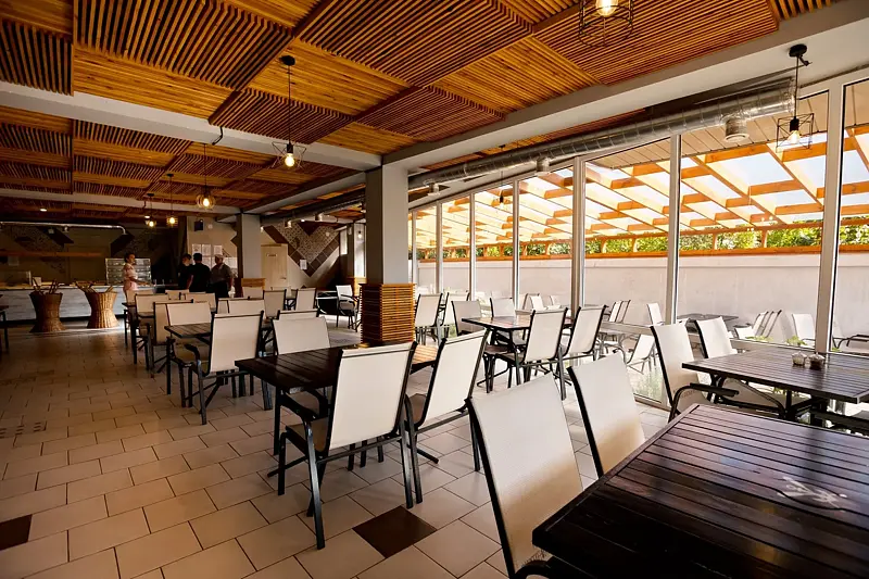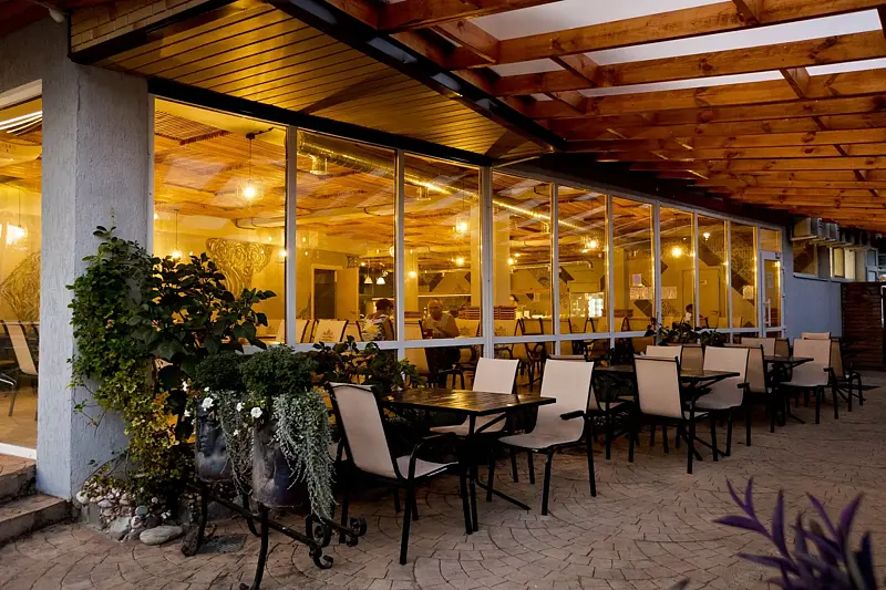 Отдыхающим в отеле предоставляются на выбор несколько вариантов питания – полный пансион или полу-пансион. Определенные дни объявляются шашлычными – любимый многими шашлык можно заказать на ужин.