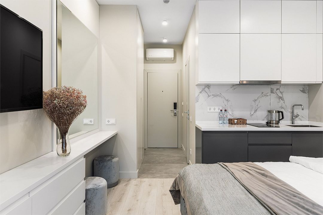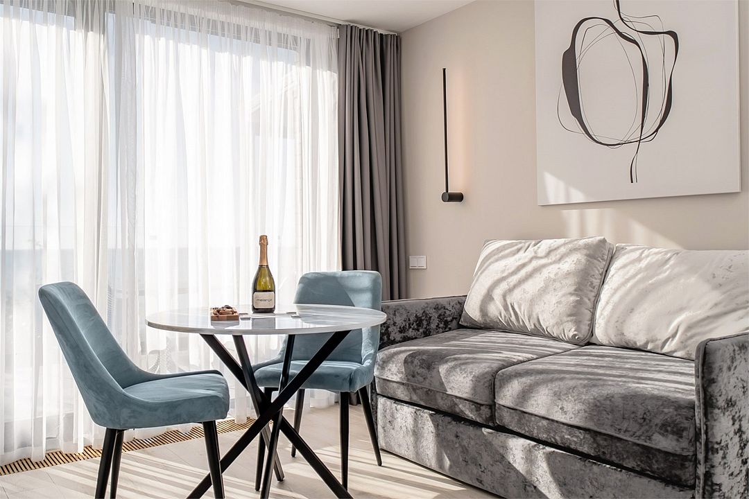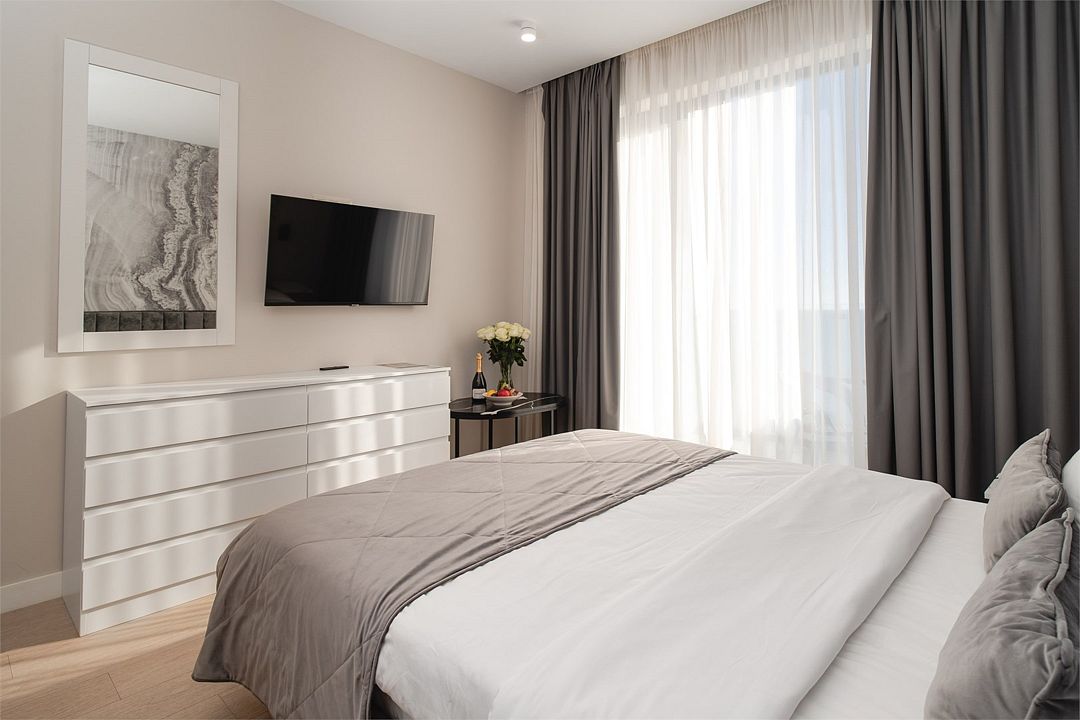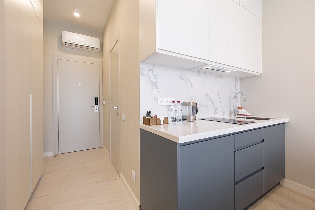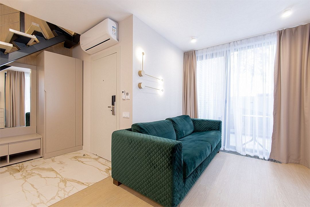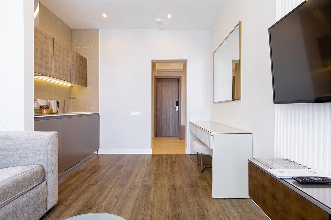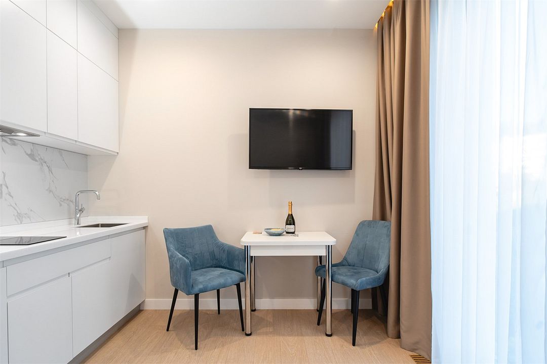Стильные однокомнатные студии без балкона, площадью 21 м². Минималистичное оформление номеров в светлых тонах и панорамные окна создают располагающую к отдыху уютную атмосферу.