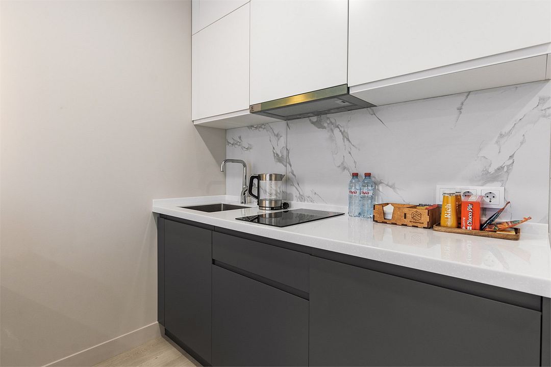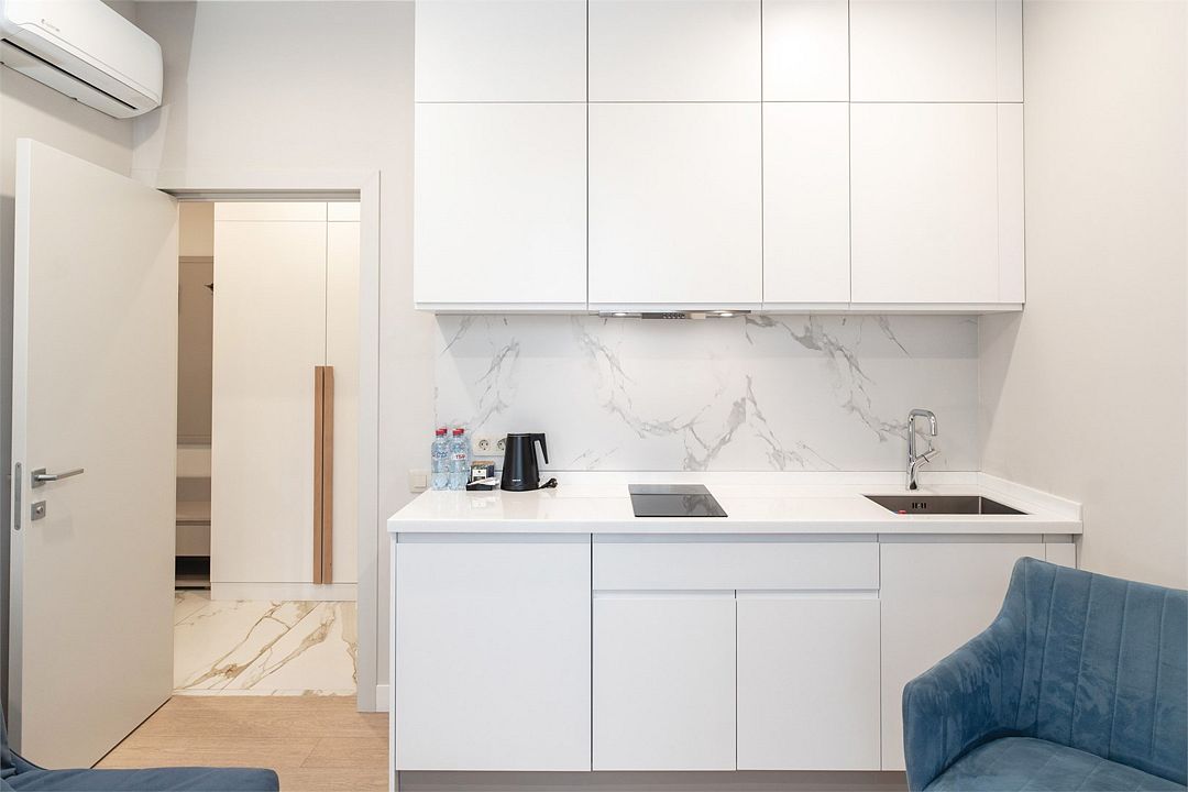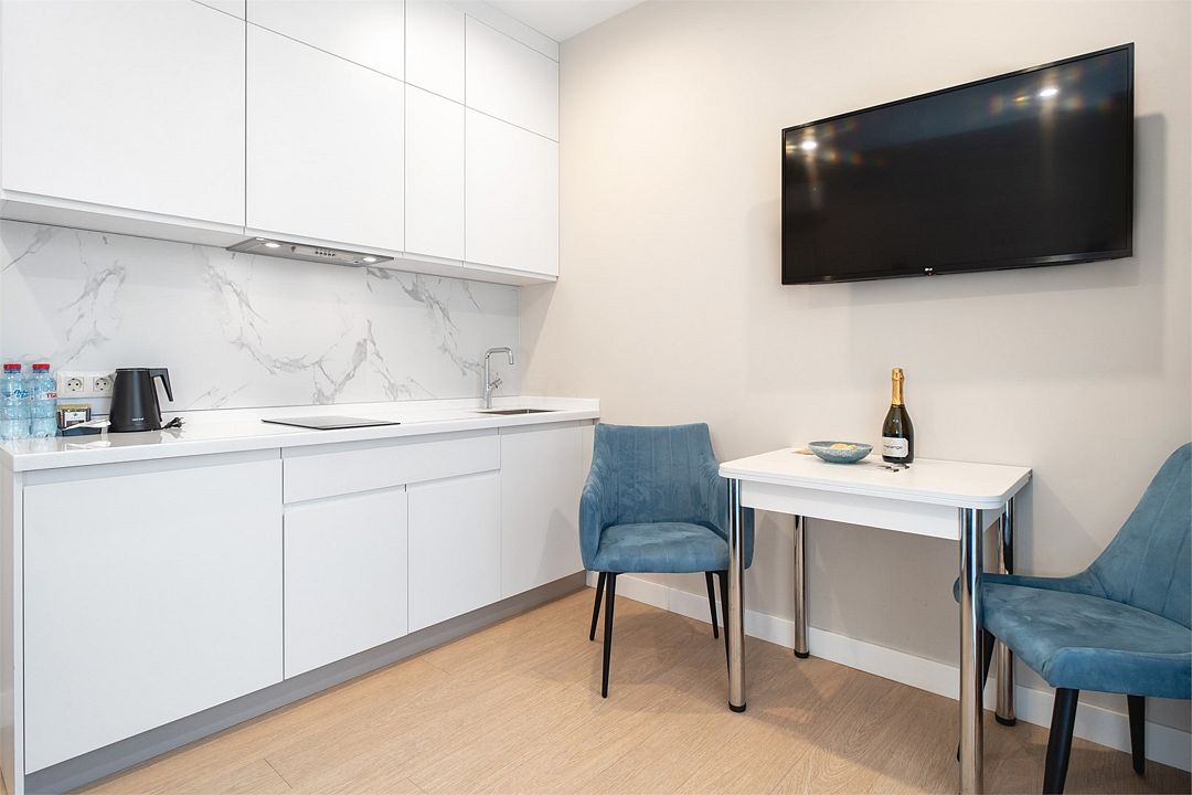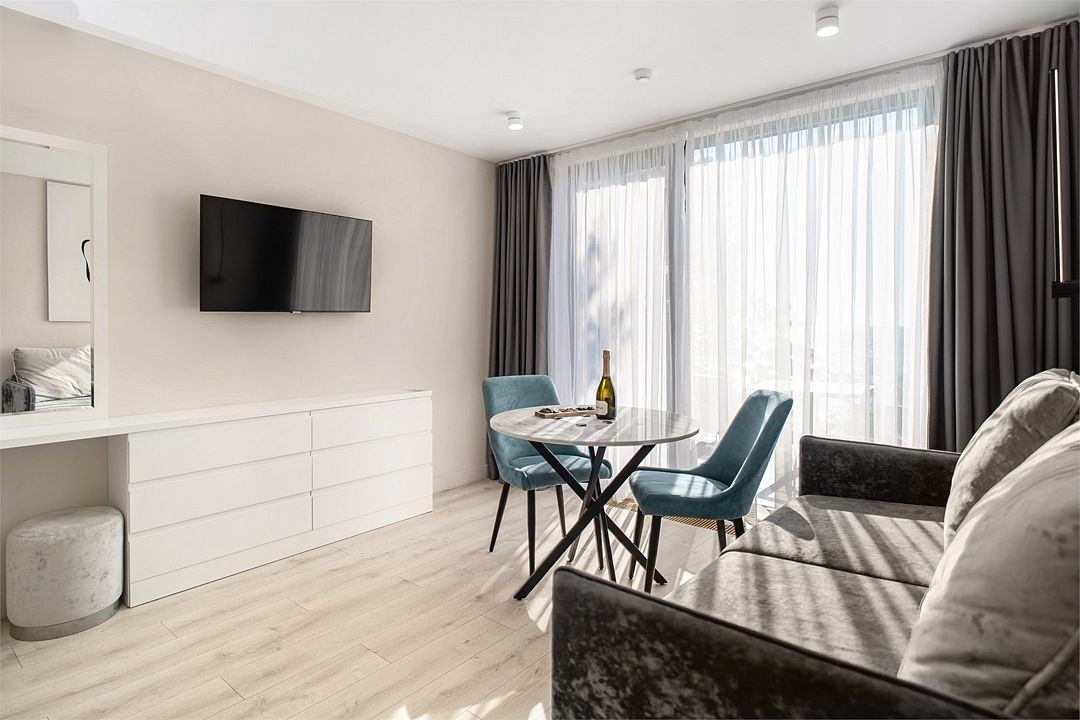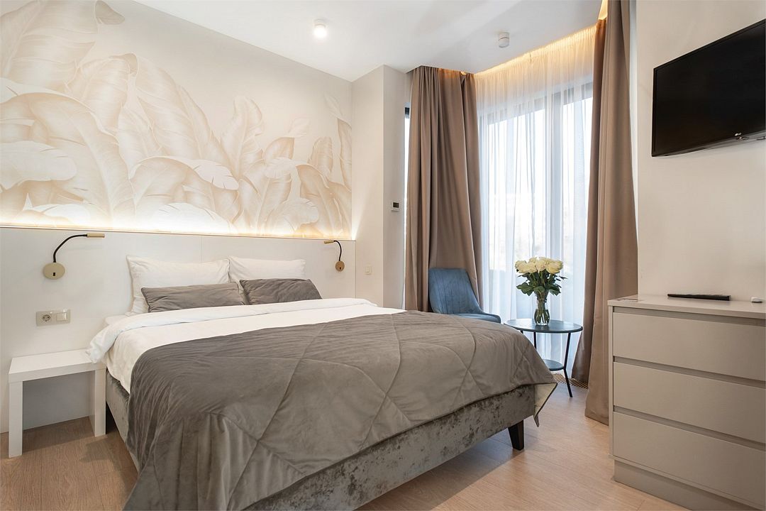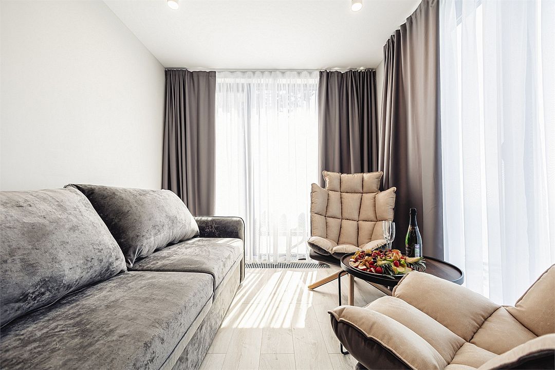 Стильные однокомнатные студии без балкона, площадью 21 м². Минималистичное оформление номеров в светлых тонах и панорамные окна создают располагающую к отдыху уютную атмосферу.