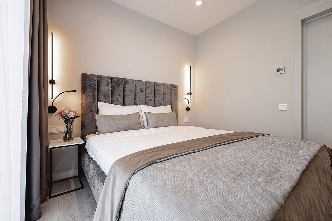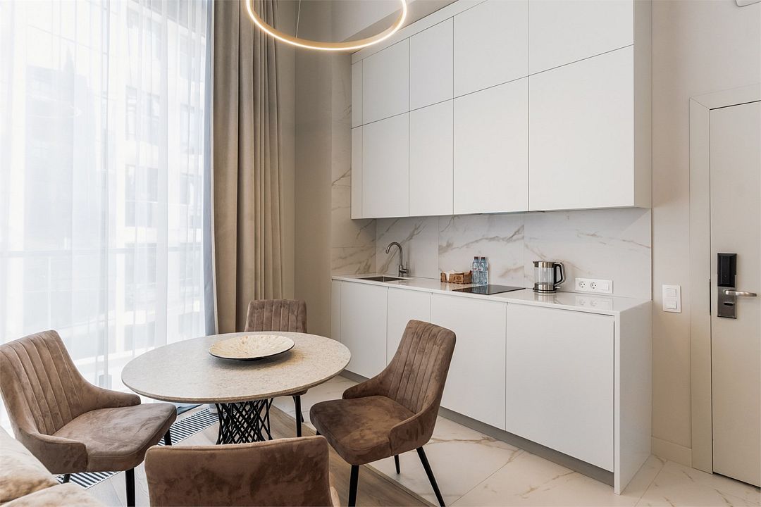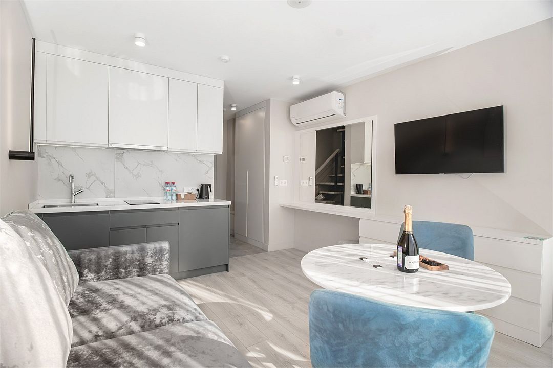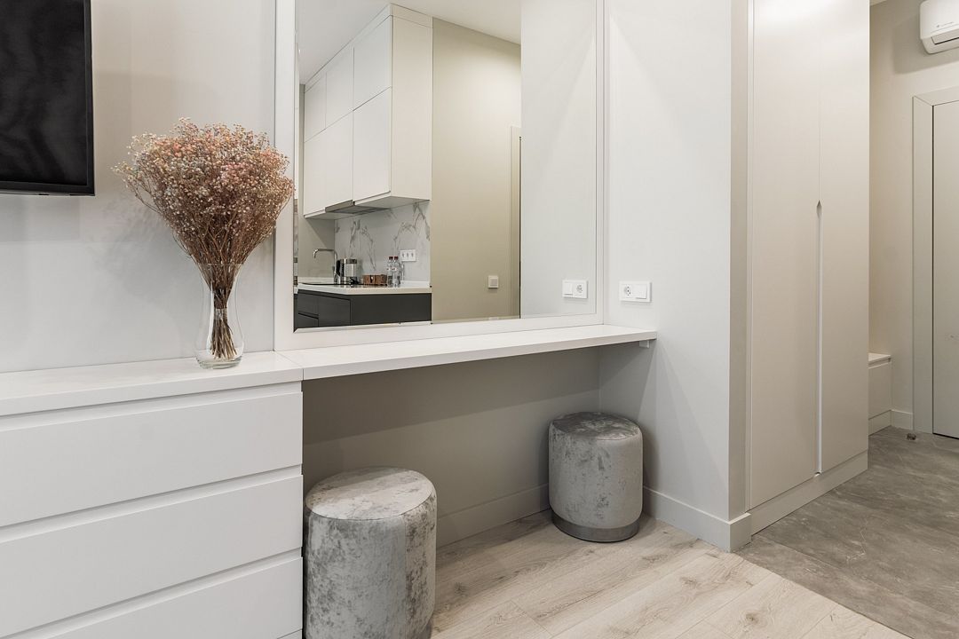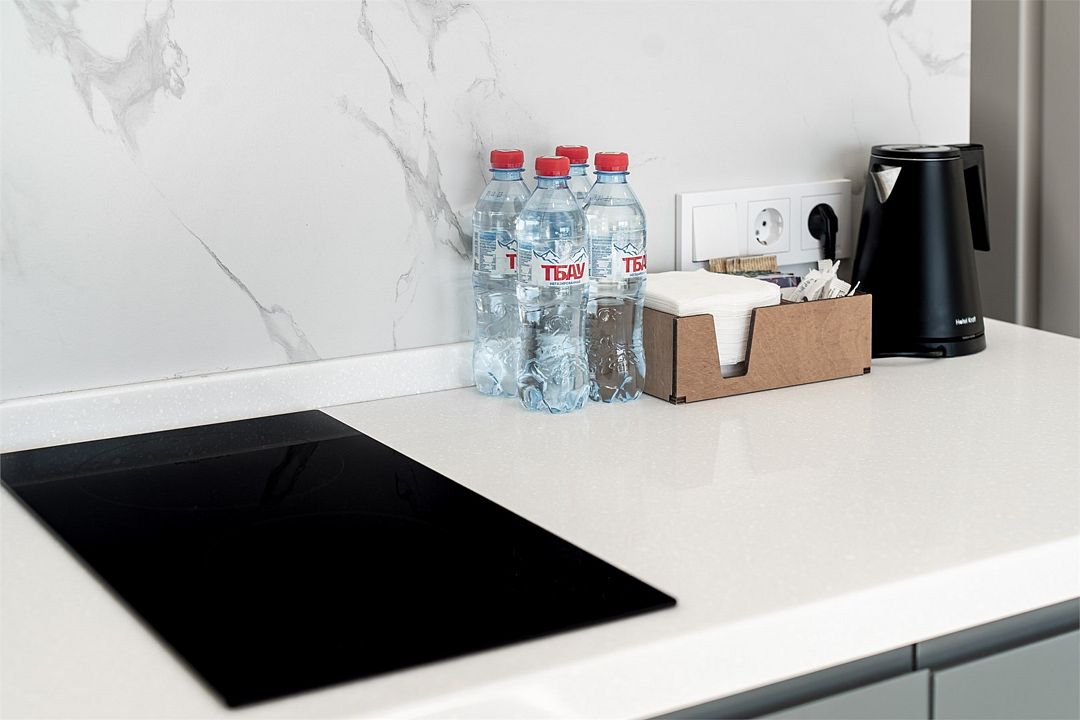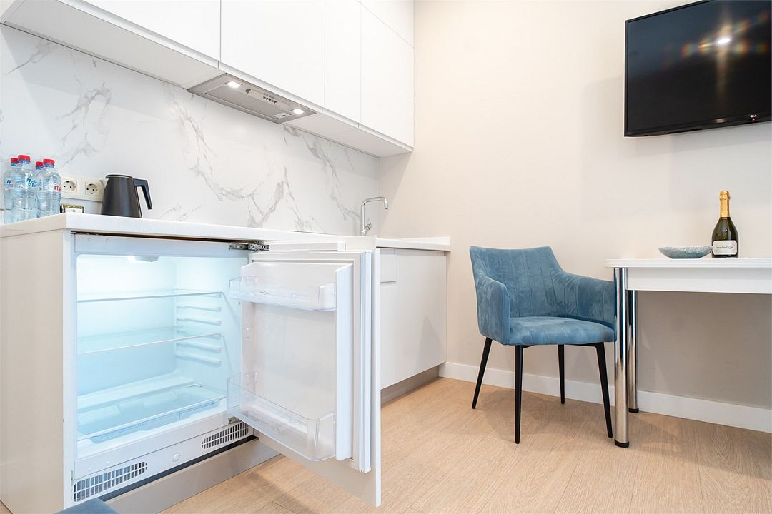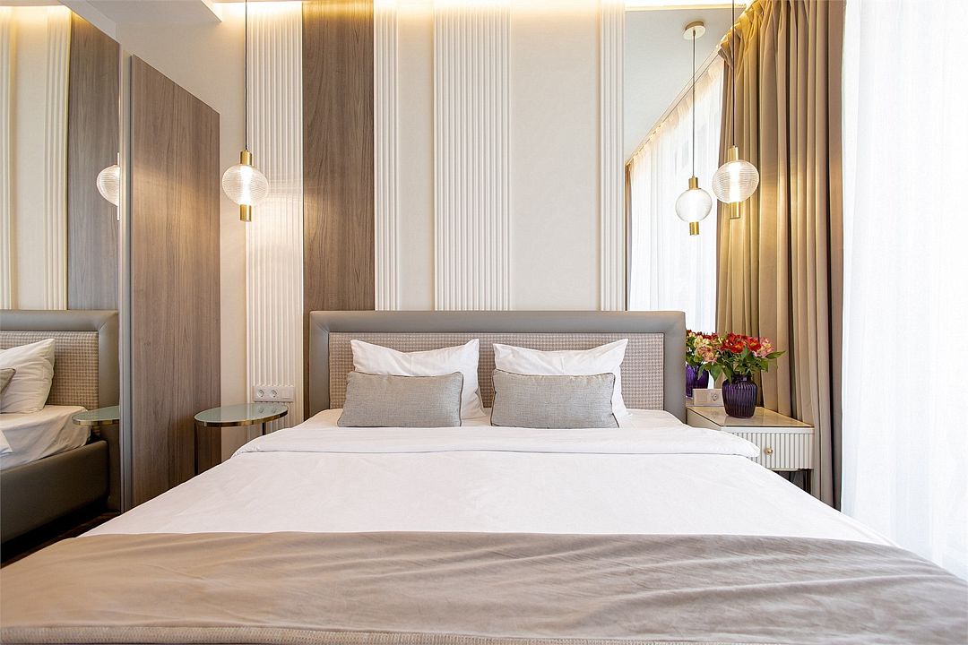 Стильные однокомнатные студии без балкона, площадью 21 м². Минималистичное оформление номеров в светлых тонах и панорамные окна создают располагающую к отдыху уютную атмосферу.