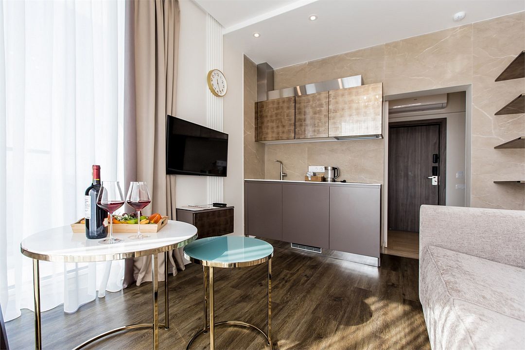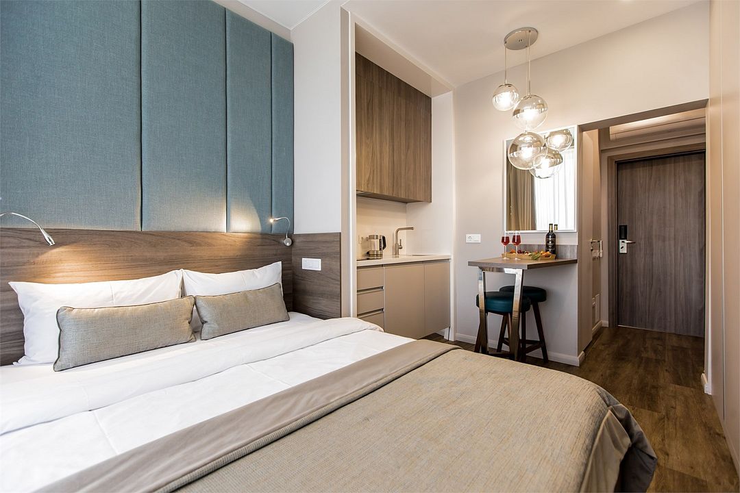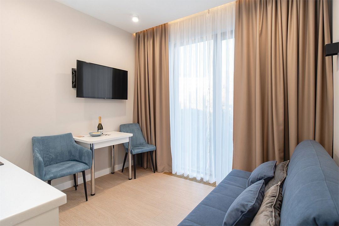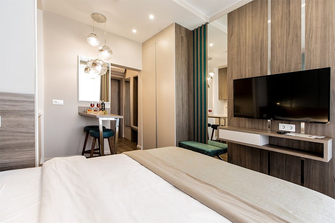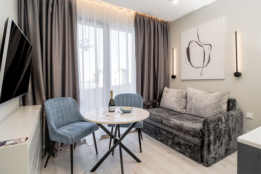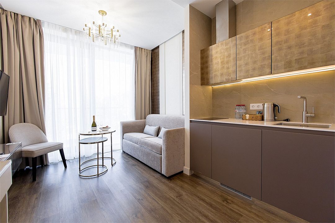 Стильные однокомнатные апартаменты, площадью 21 м², отличаются современным и эргономичным дизайном. Номера категории Студия располагаются в разных корпусах отеля, конкретный корпус не гарантируется.