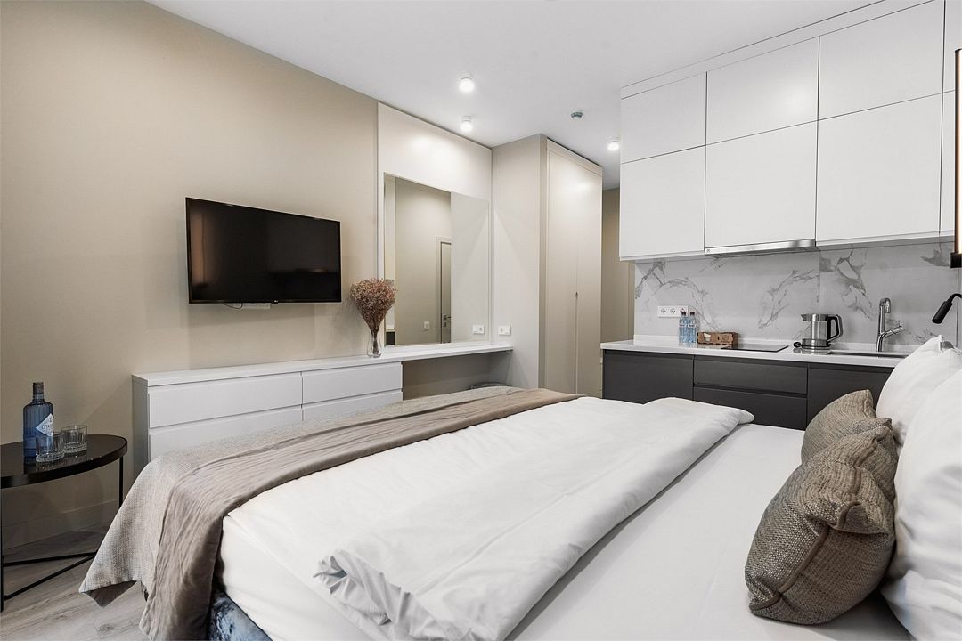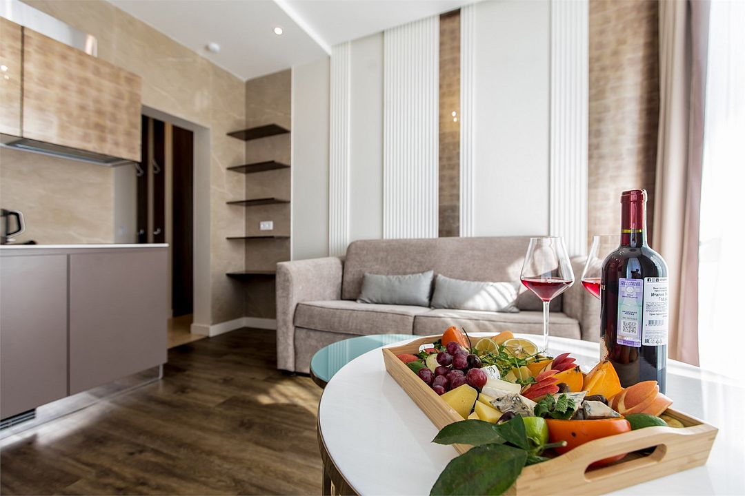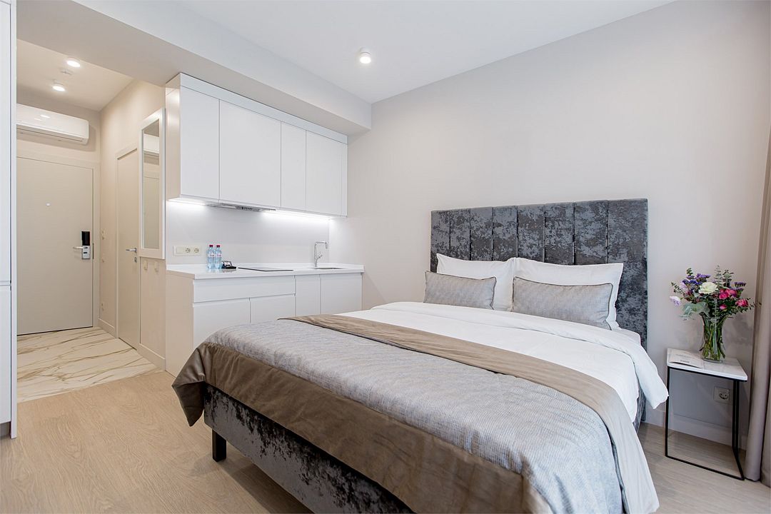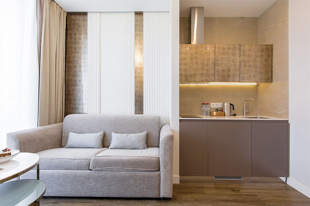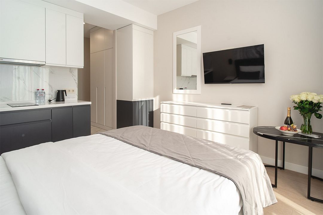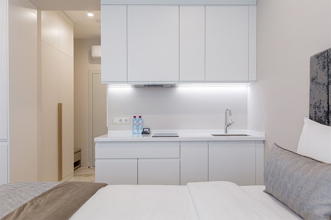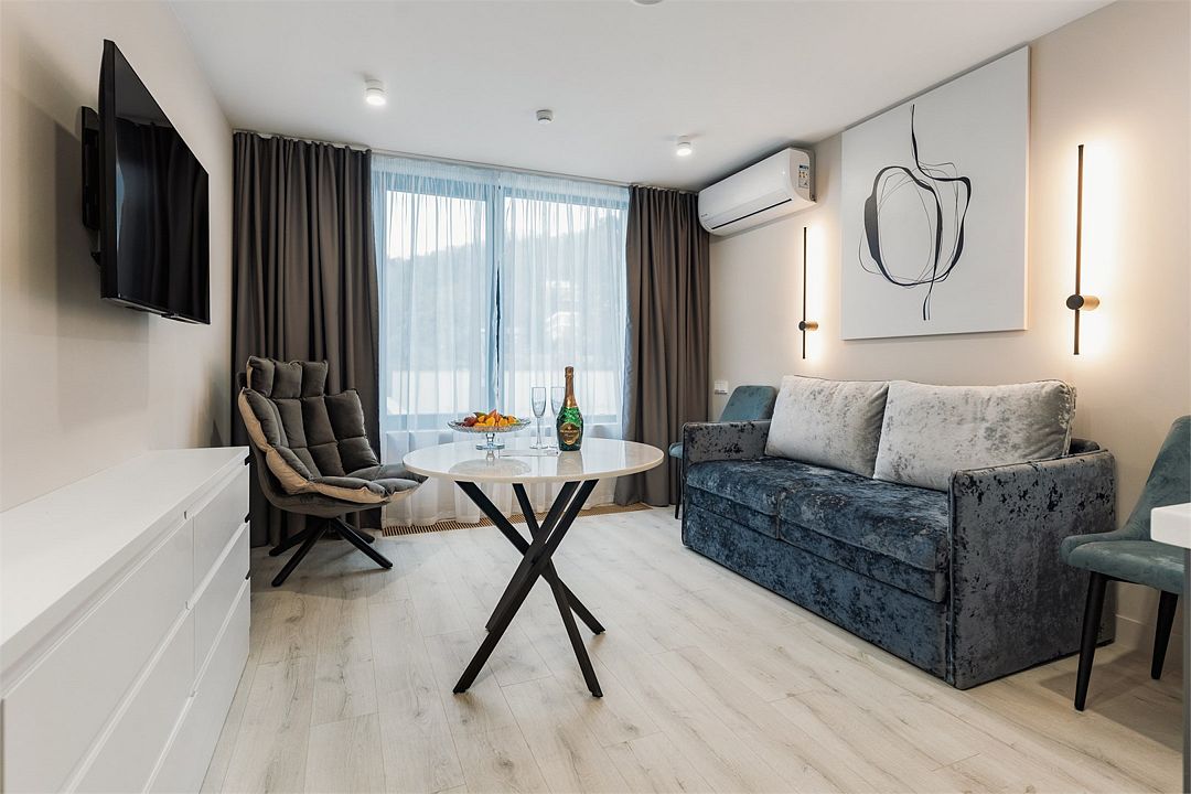 Стильные однокомнатные апартаменты, площадью 21 м², отличаются современным и эргономичным дизайном. Номера категории Студия располагаются в разных корпусах отеля, конкретный корпус не гарантируется.