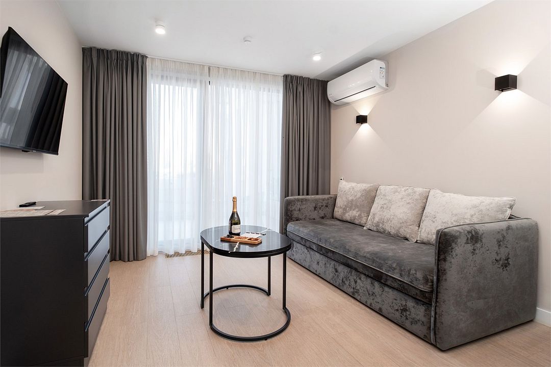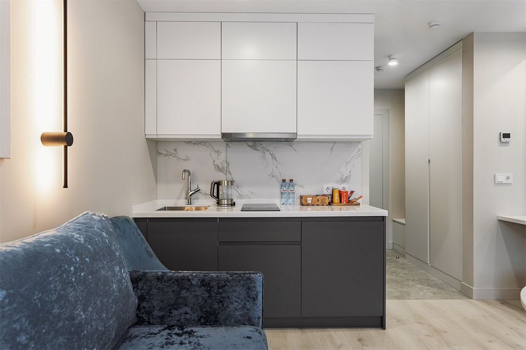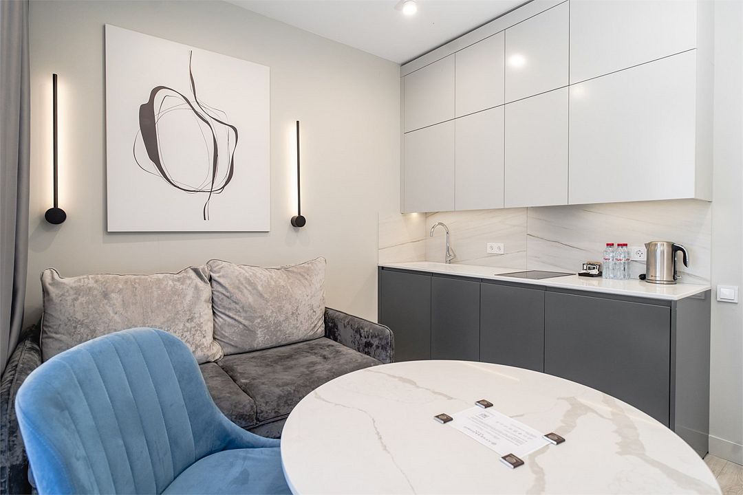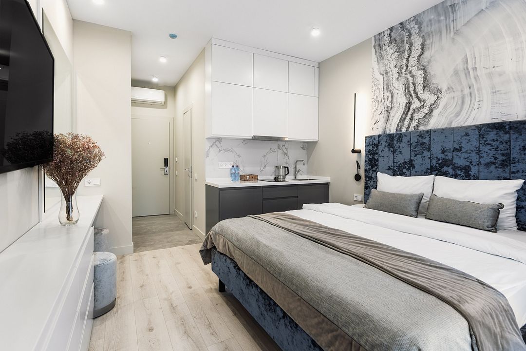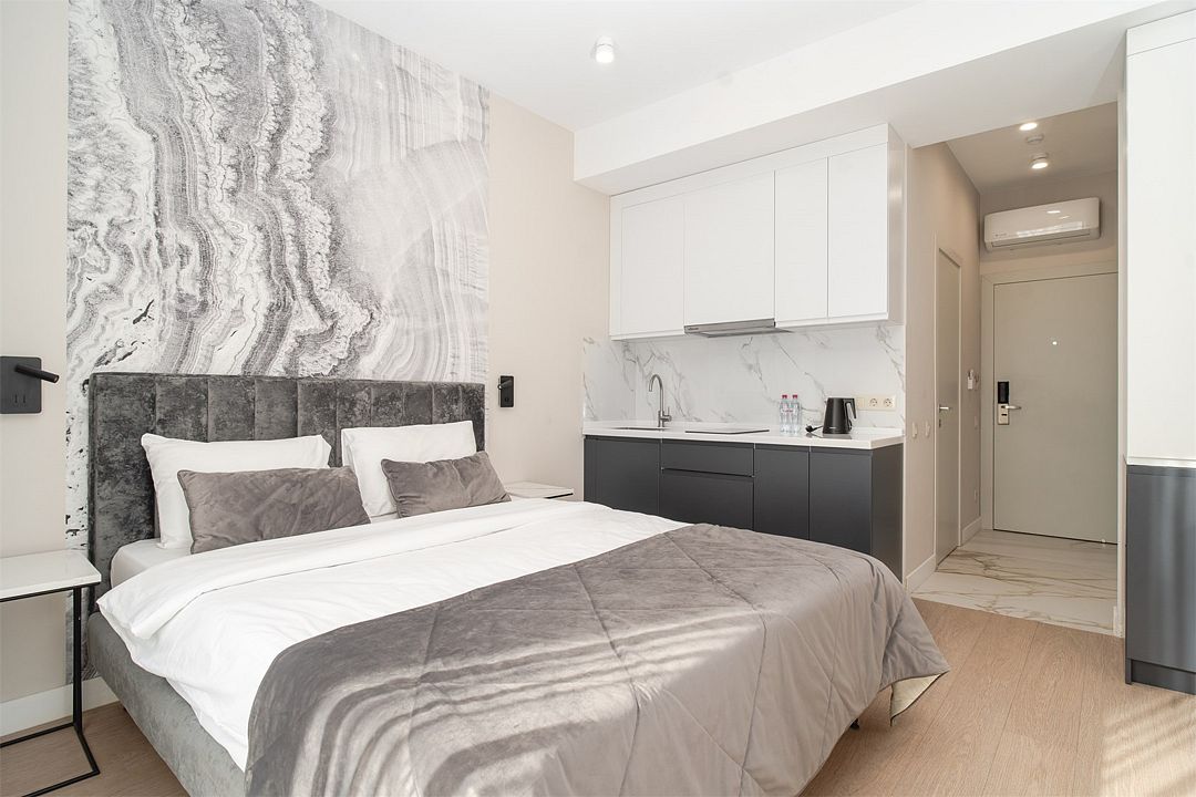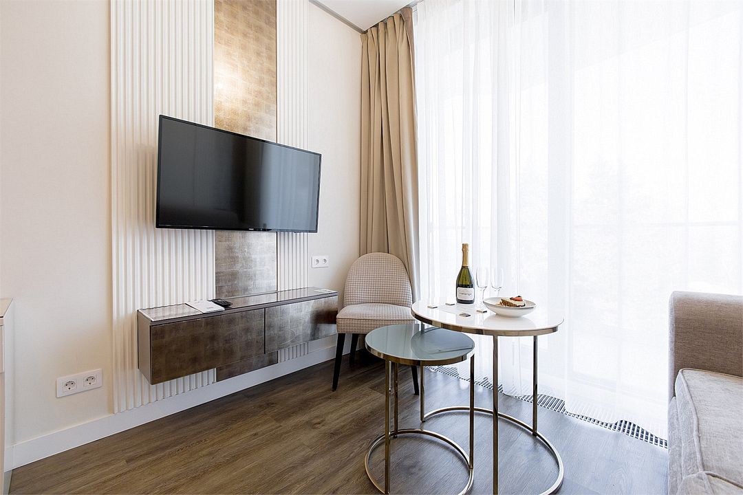 Стильные однокомнатные апартаменты, площадью 21 м², отличаются современным и эргономичным дизайном. Номера категории Студия располагаются в разных корпусах отеля, конкретный корпус не гарантируется.