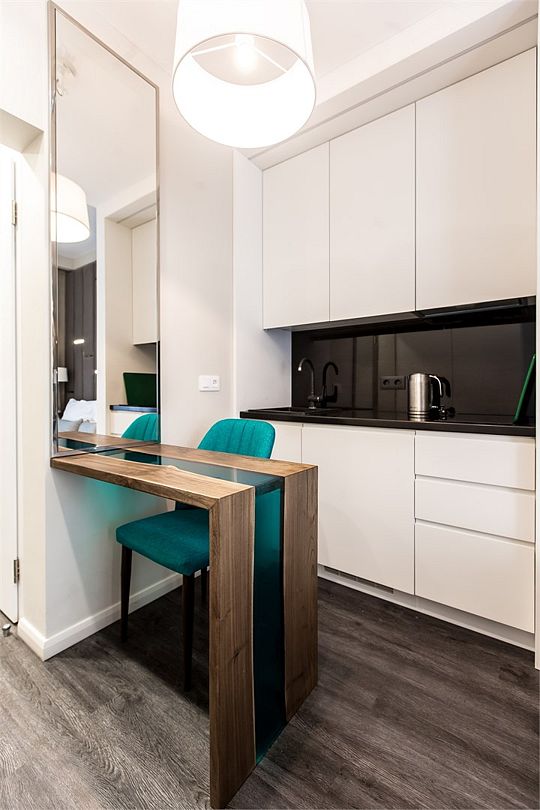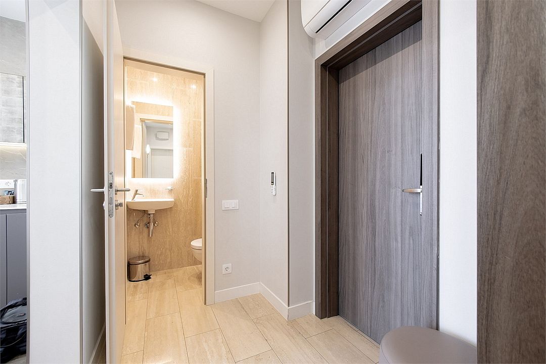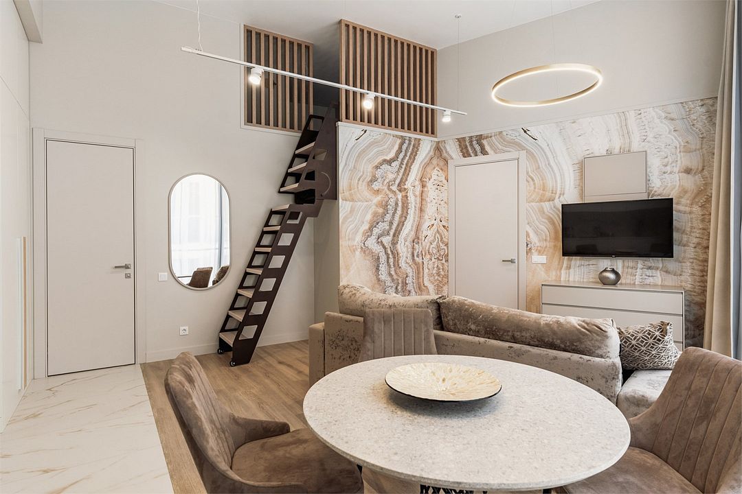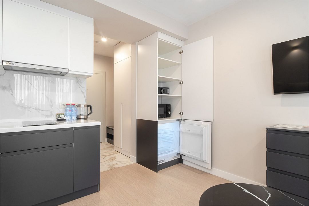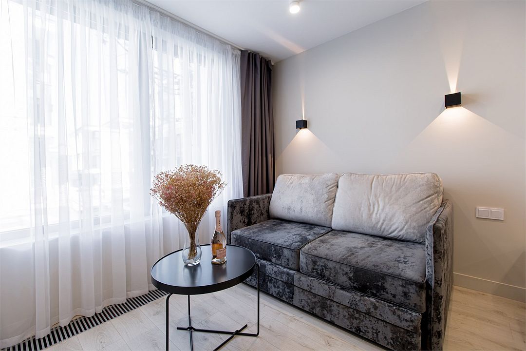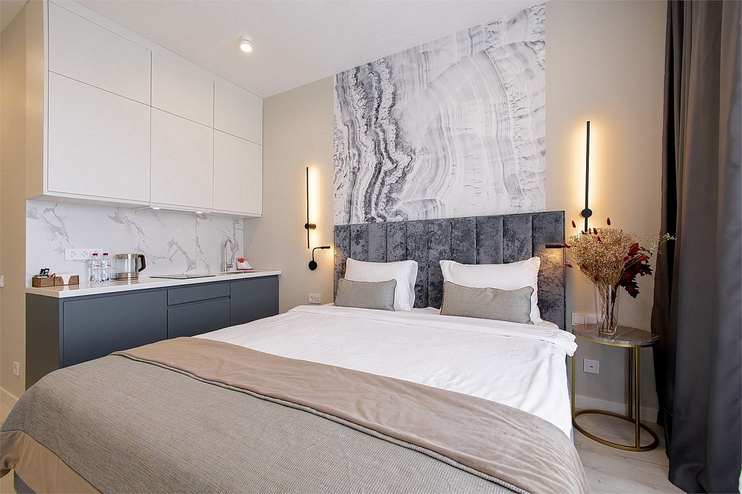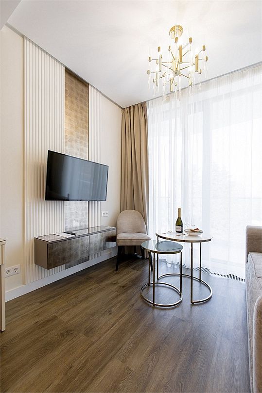 Стильные однокомнатные апартаменты, площадью 21 м², отличаются современным и эргономичным дизайном. Номера категории Студия располагаются в разных корпусах отеля, конкретный корпус не гарантируется.