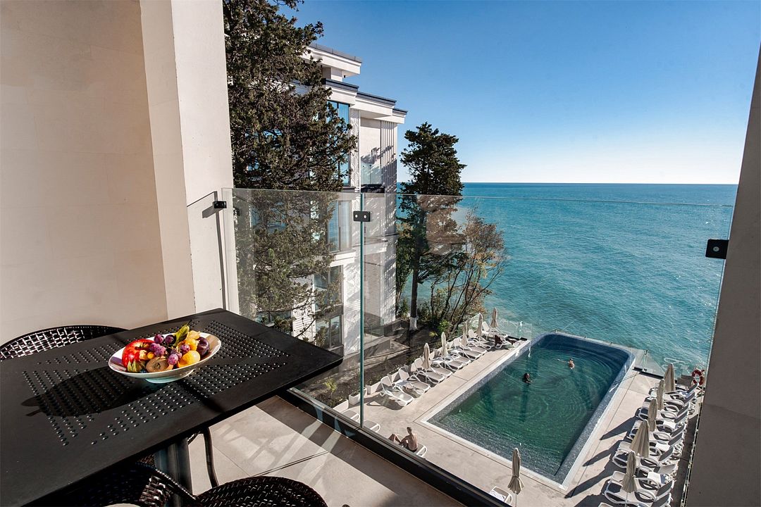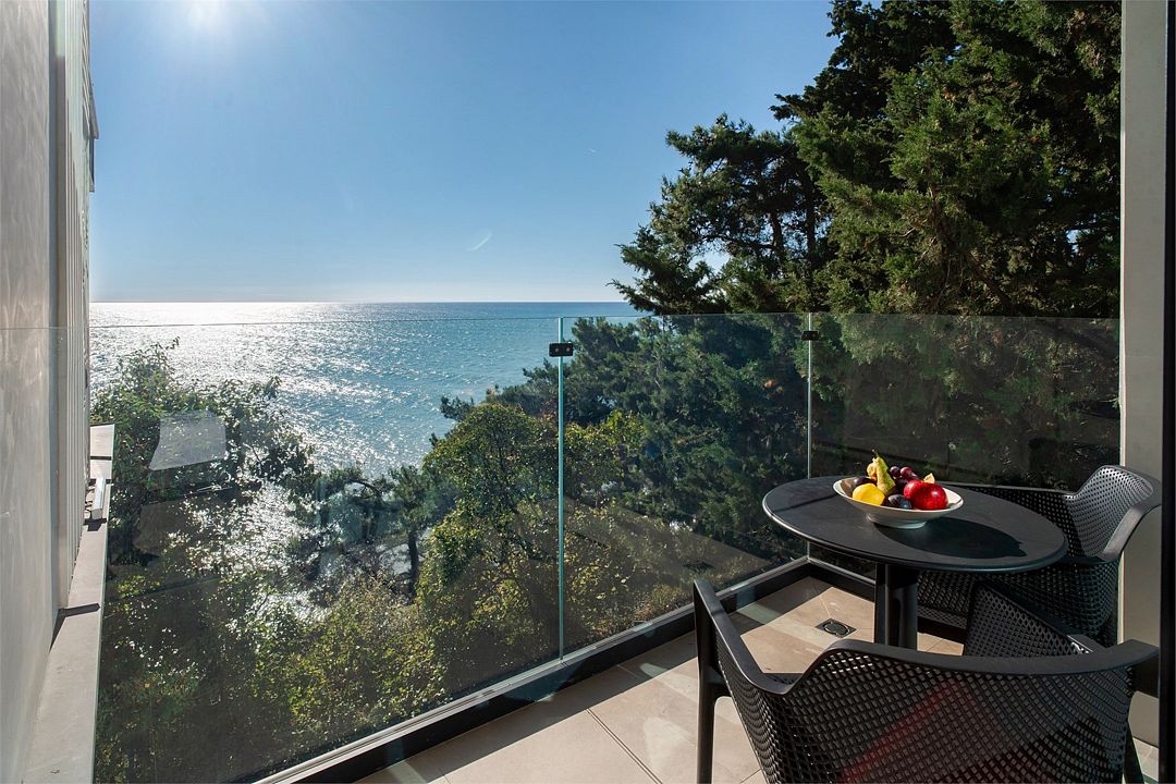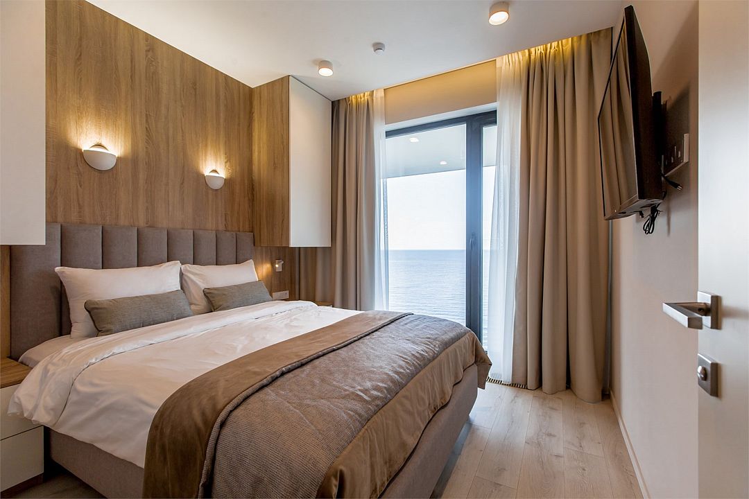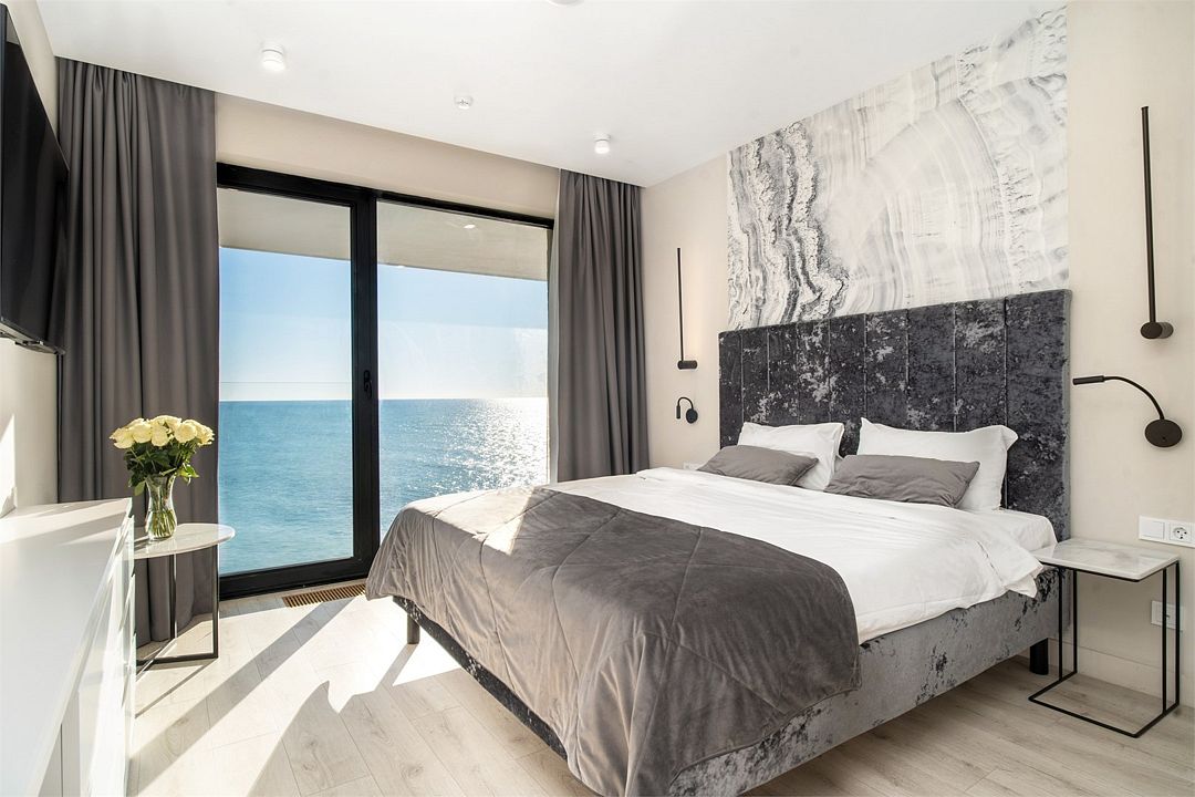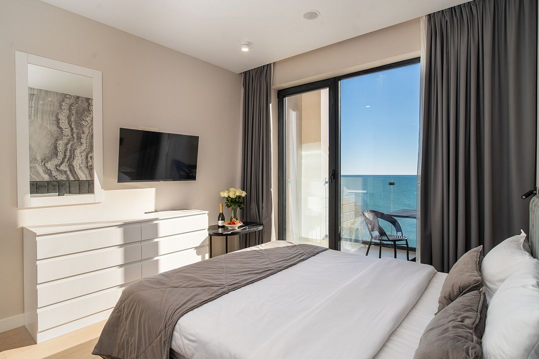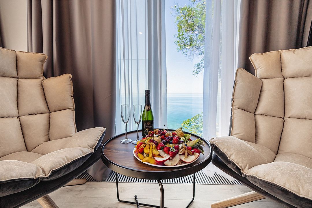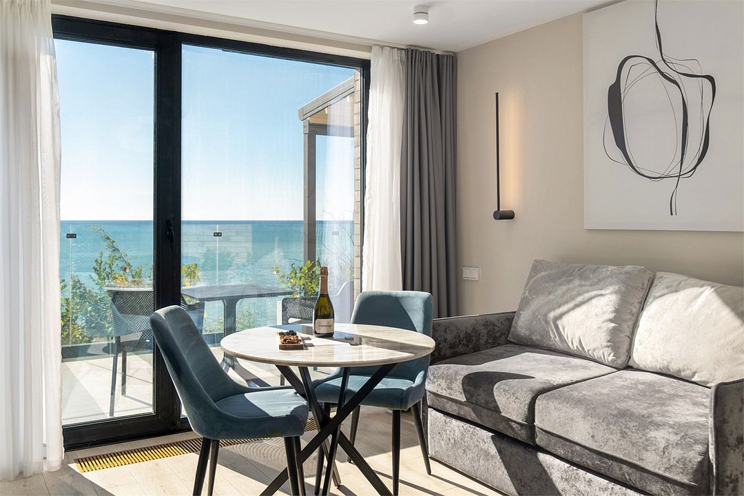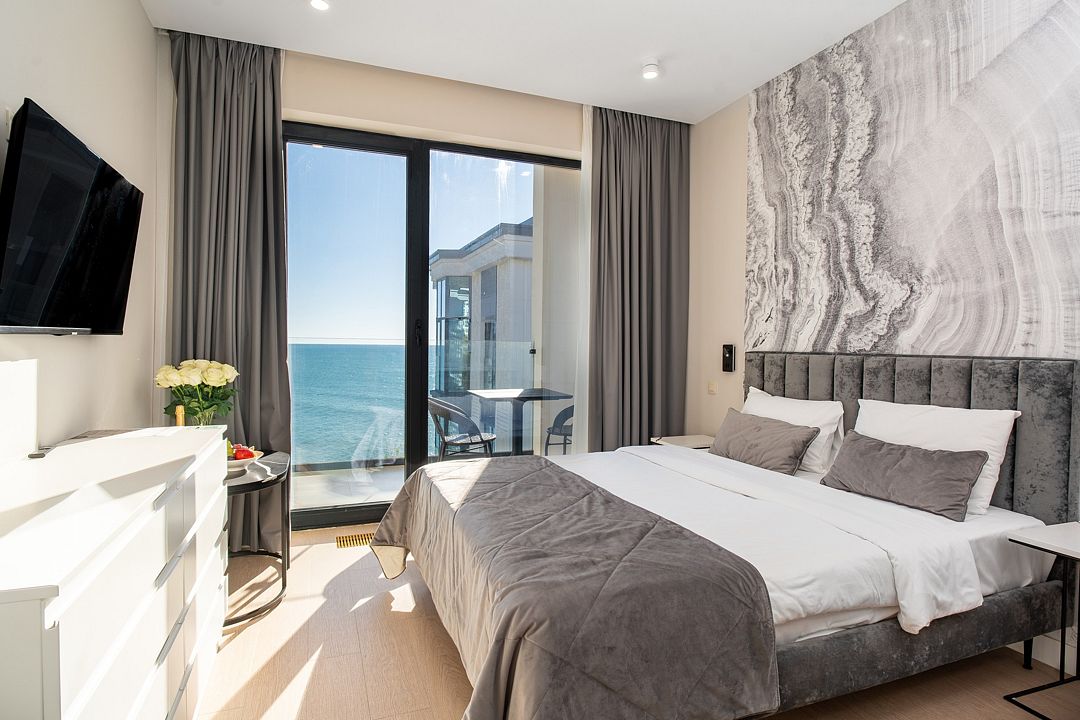 Двухкомнатные стильные апартаменты категории «Делюкс», площадью 50 м², идеально подходят для семейного размещения или отдыха повышенной комфортности. Панорамные окна и балкон, с которого открывается вид на море, создают неповторимую атмосферу и дают в полной мере насладиться отдыхом на побережье.