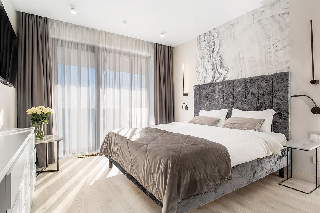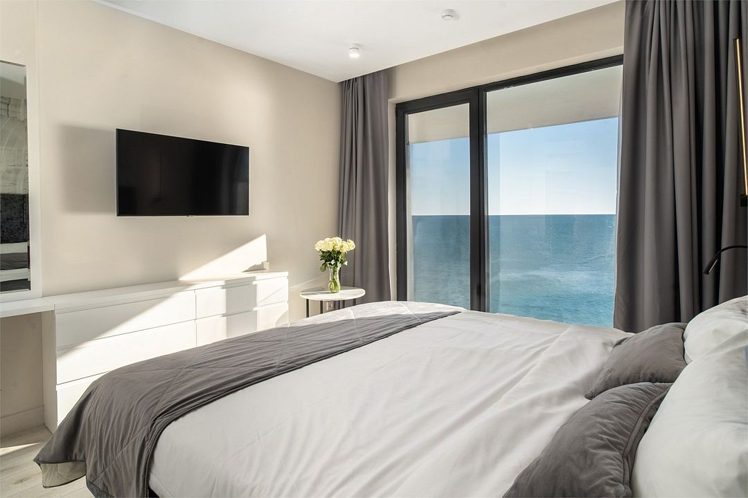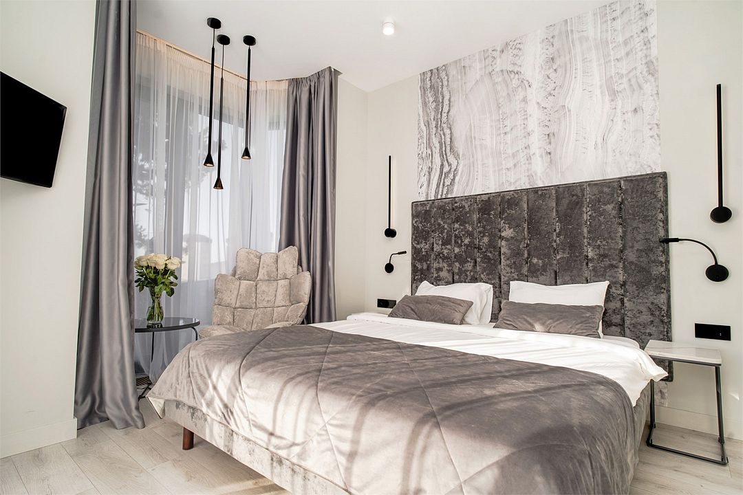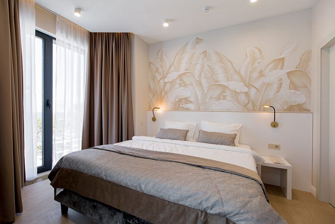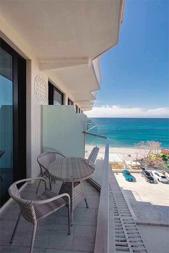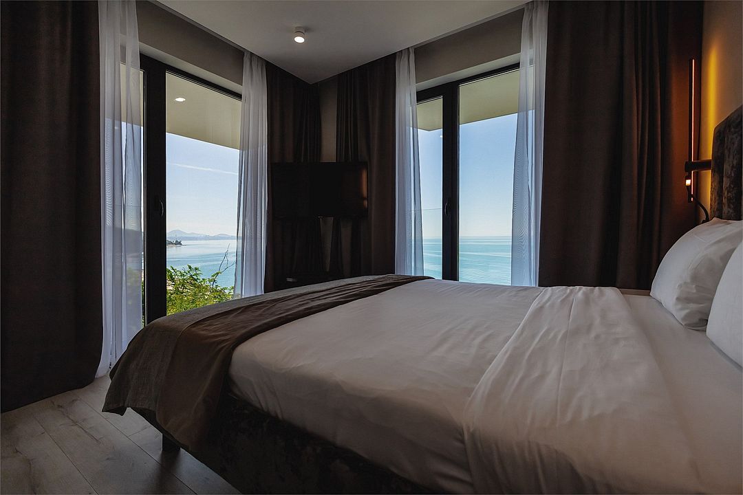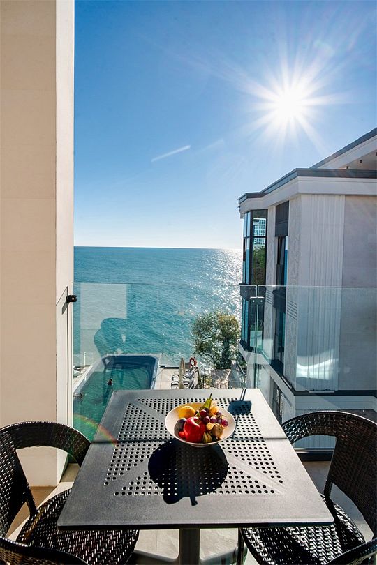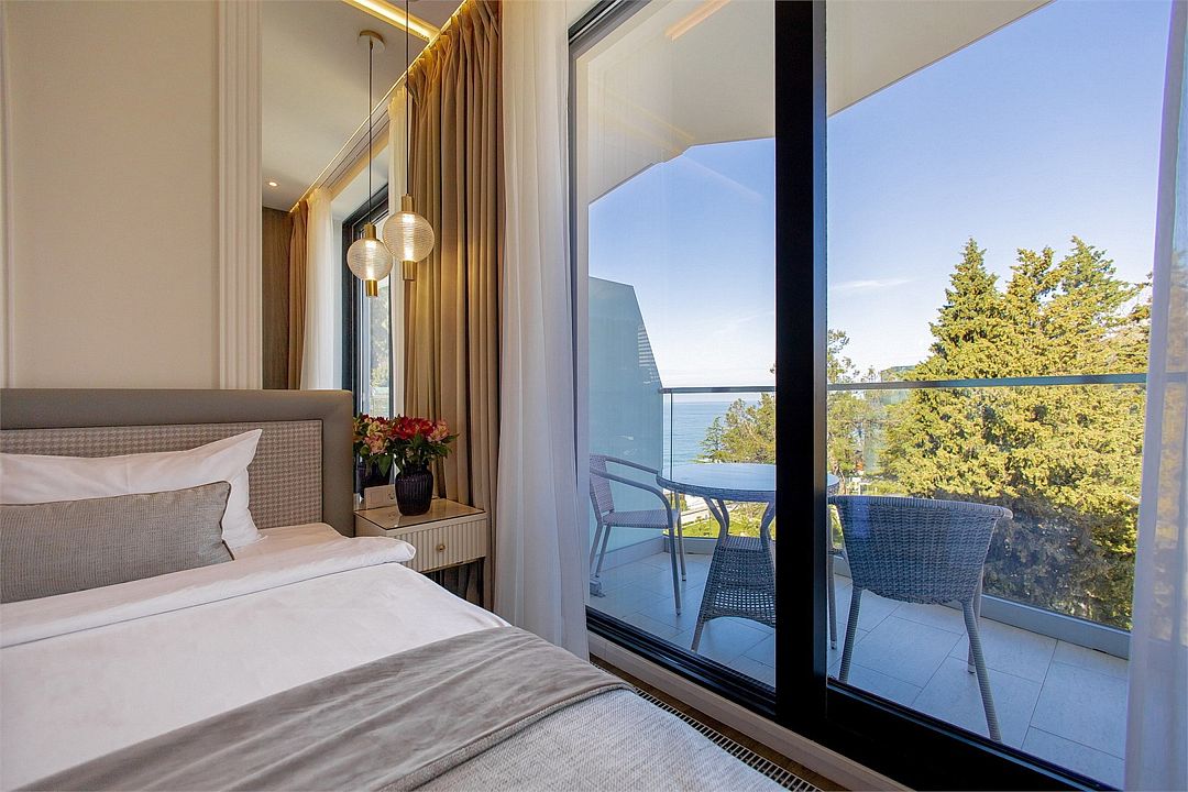 Двухкомнатные стильные апартаменты категории «Делюкс», площадью 50 м², идеально подходят для семейного размещения или отдыха повышенной комфортности. Панорамные окна и балкон, с которого открывается вид на море, создают неповторимую атмосферу и дают в полной мере насладиться отдыхом на побережье.