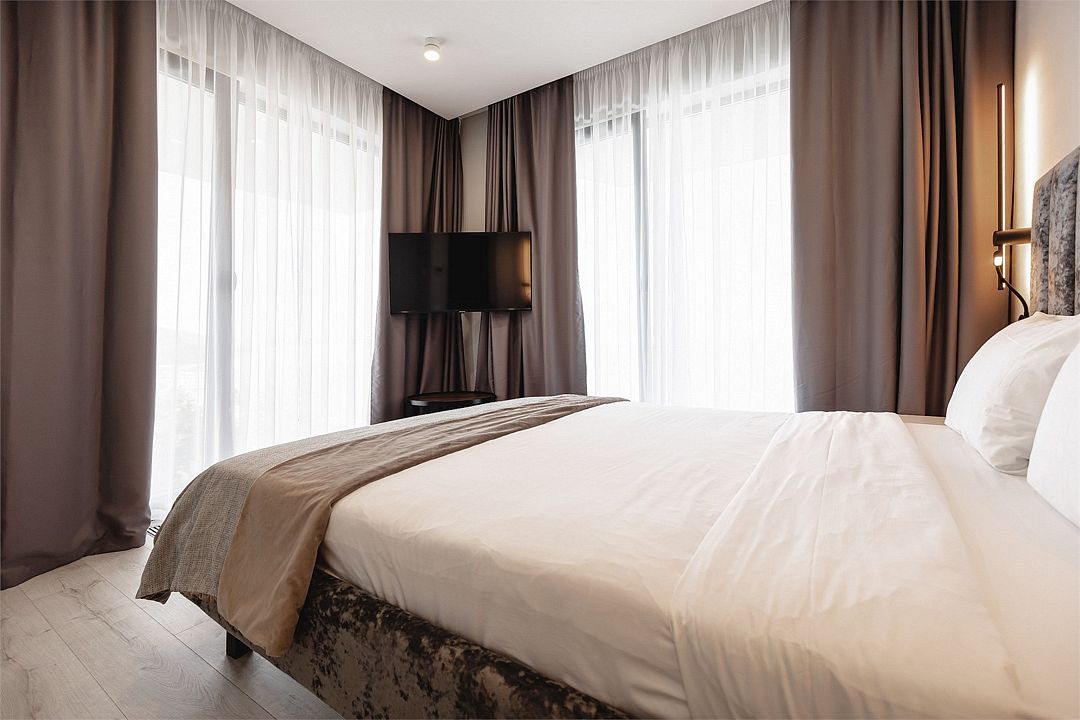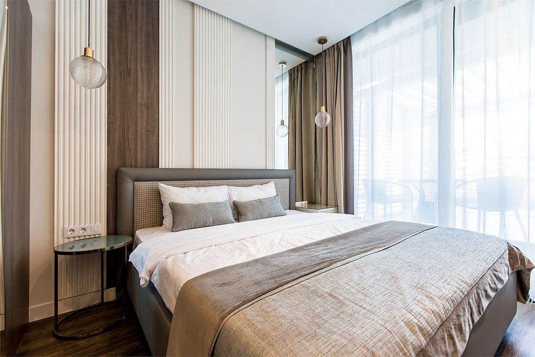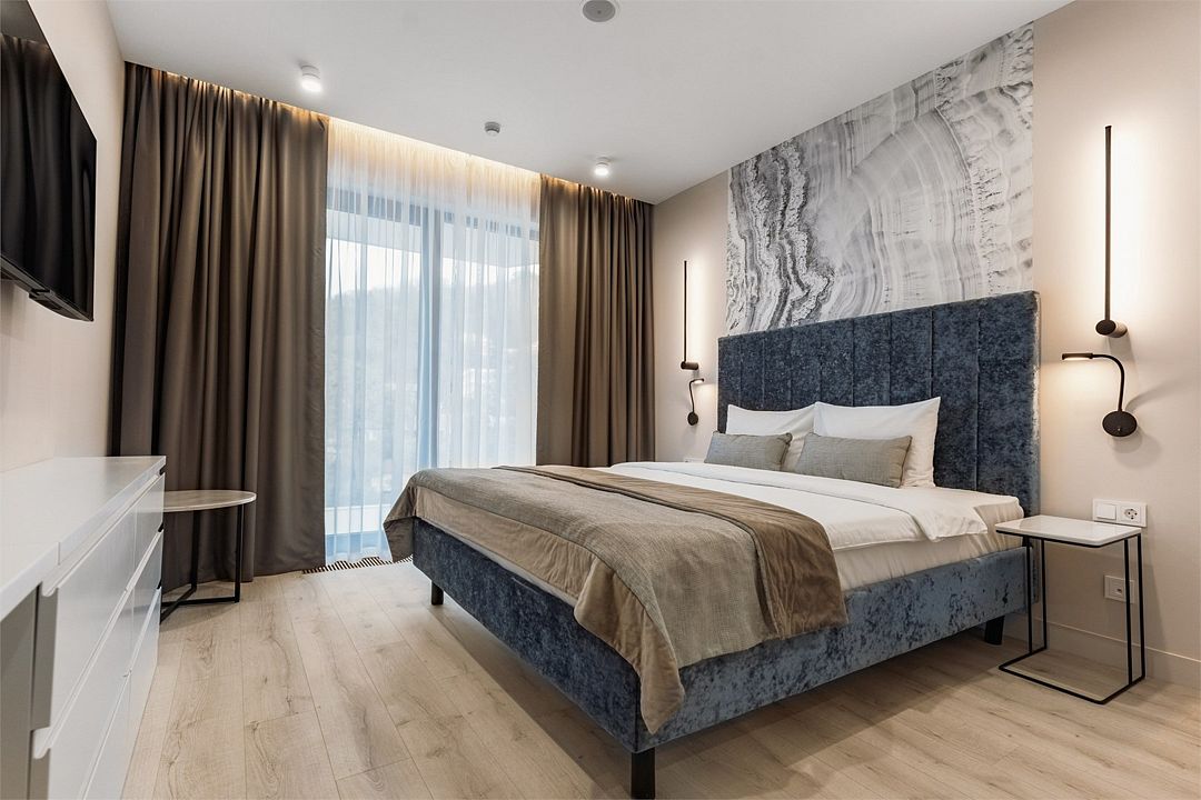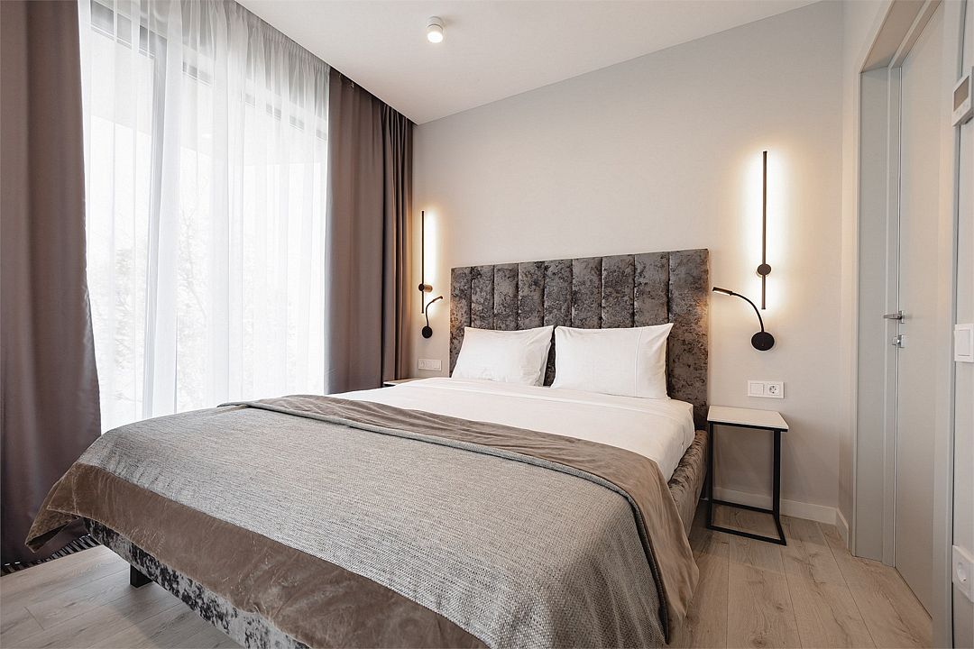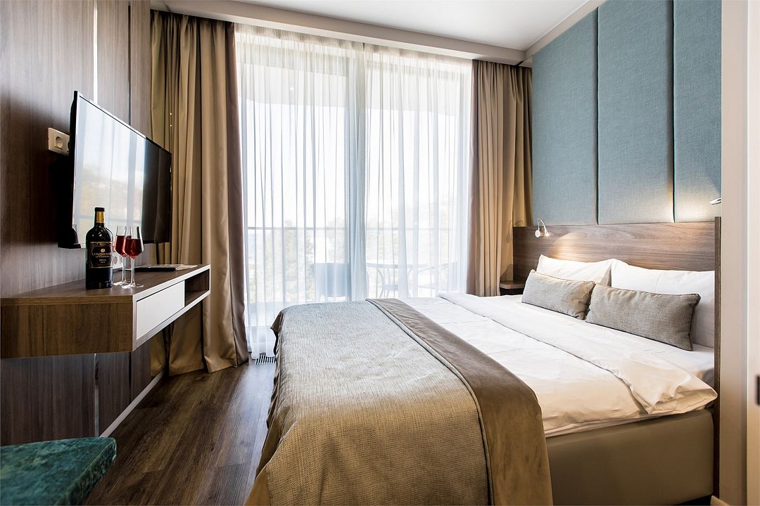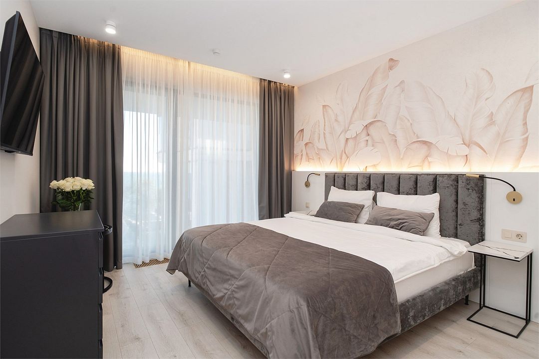 Двухкомнатные стильные апартаменты категории «Делюкс», площадью 50 м², идеально подходят для семейного размещения или отдыха повышенной комфортности. Все номера располагают панорамными окнами и просторным балконом с видом на парковую территорию.