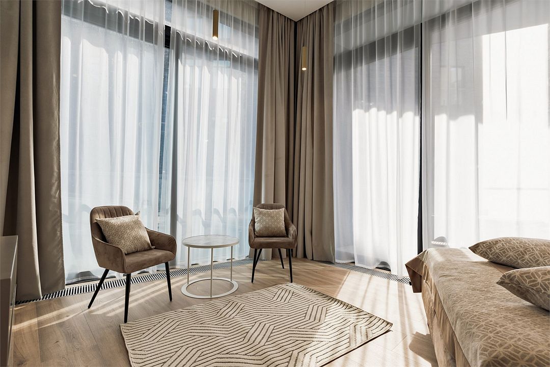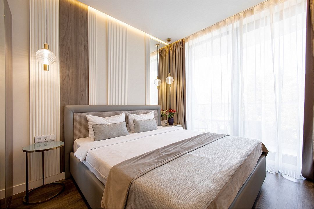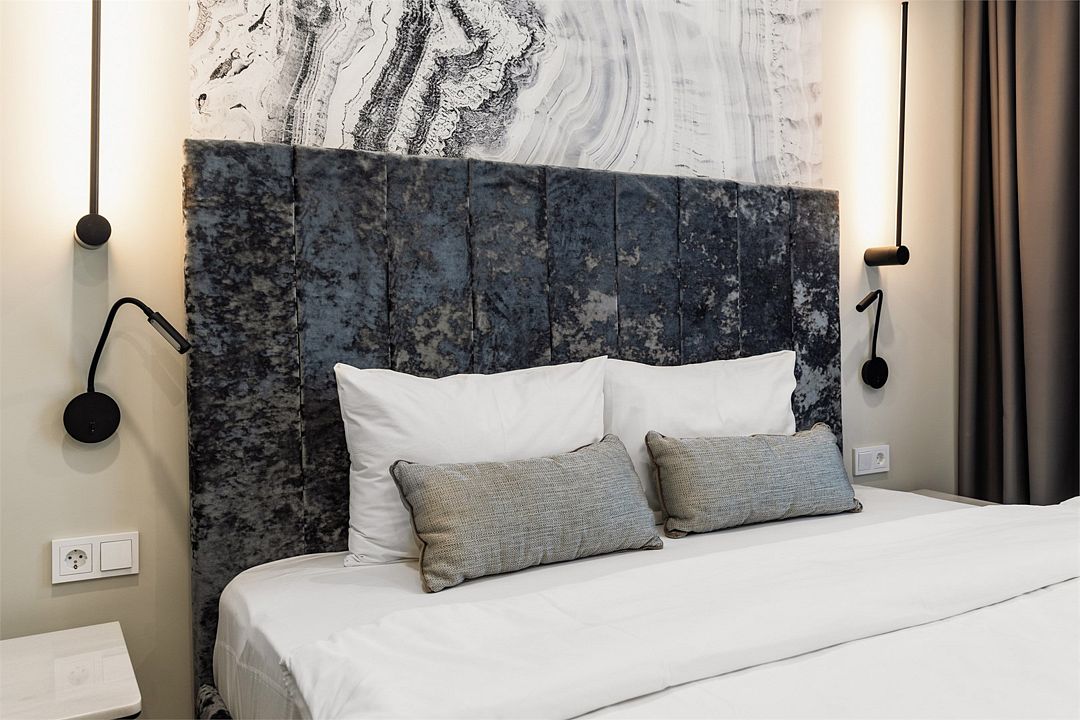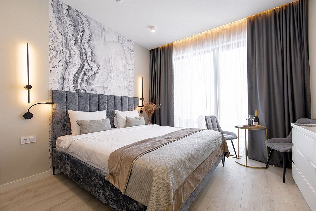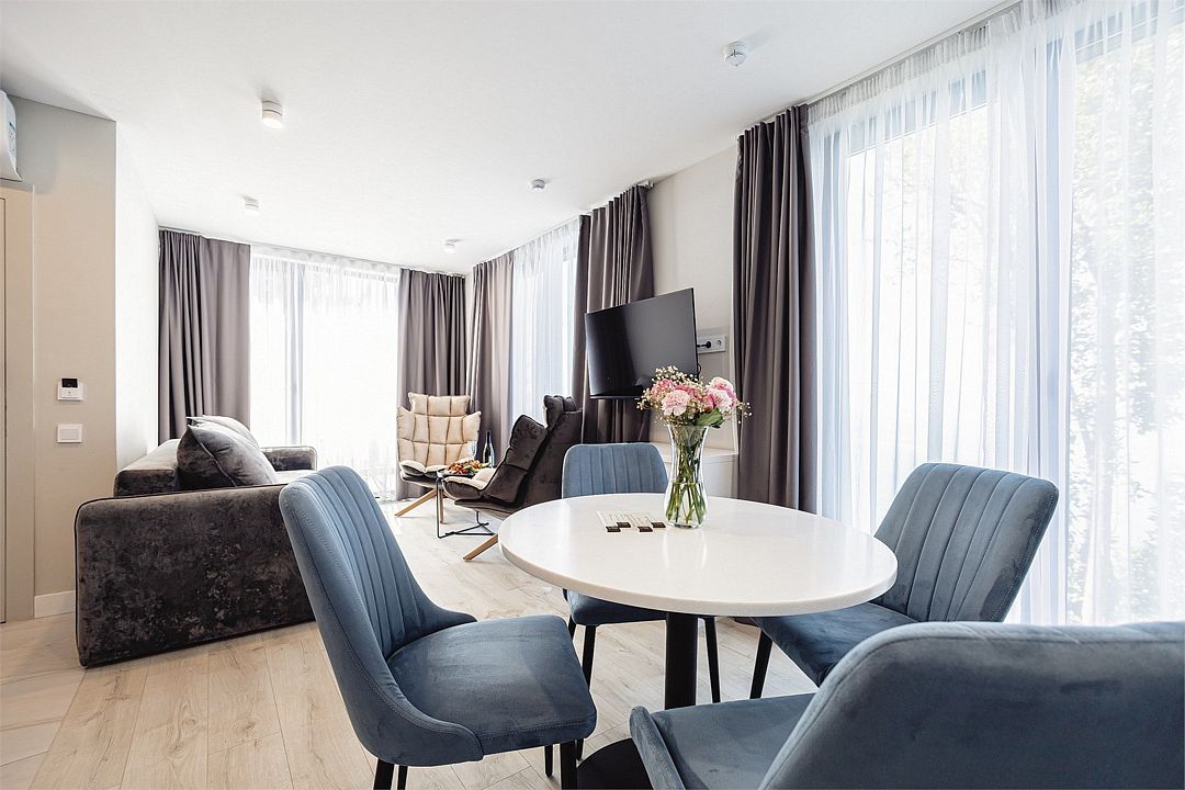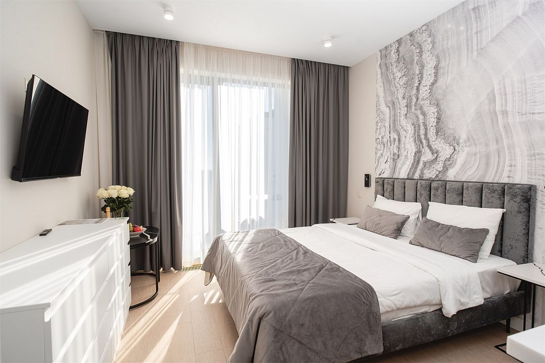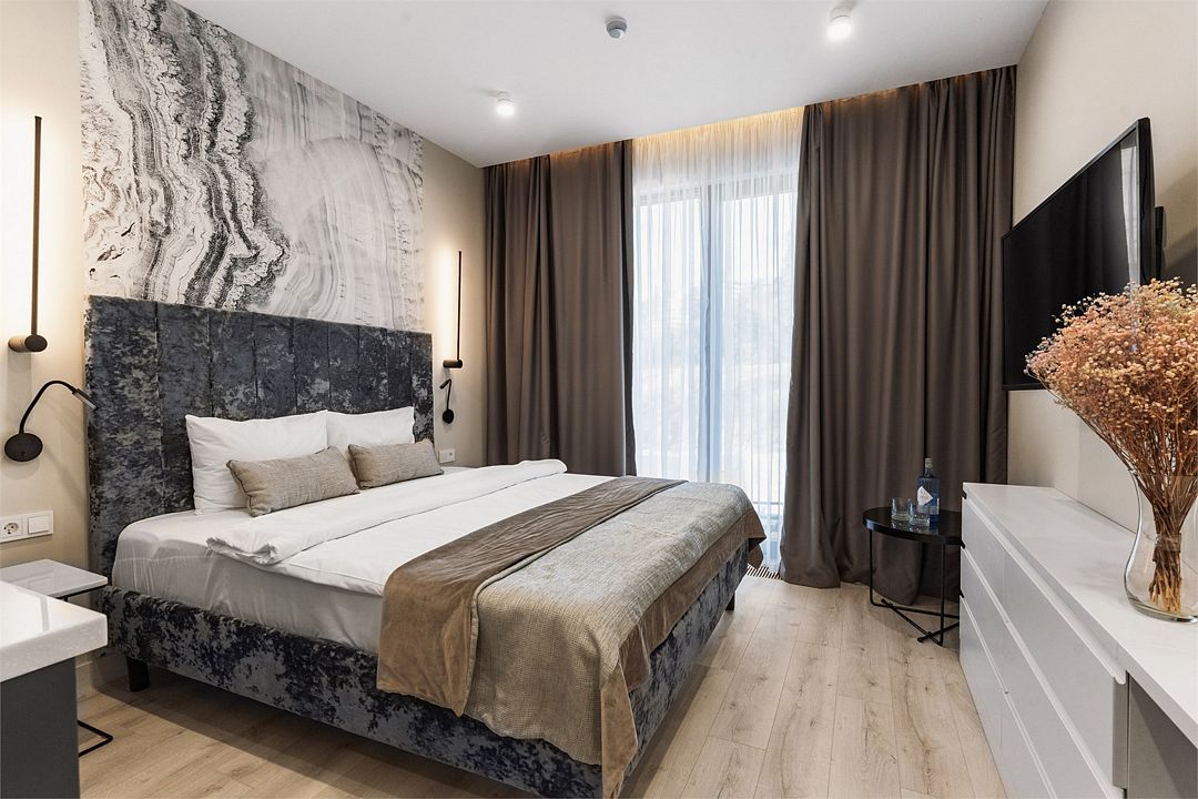 Двухкомнатные стильные апартаменты категории «Делюкс», площадью 50 м², идеально подходят для семейного размещения или отдыха повышенной комфортности. Все номера располагают панорамными окнами и просторным балконом с видом на парковую территорию.