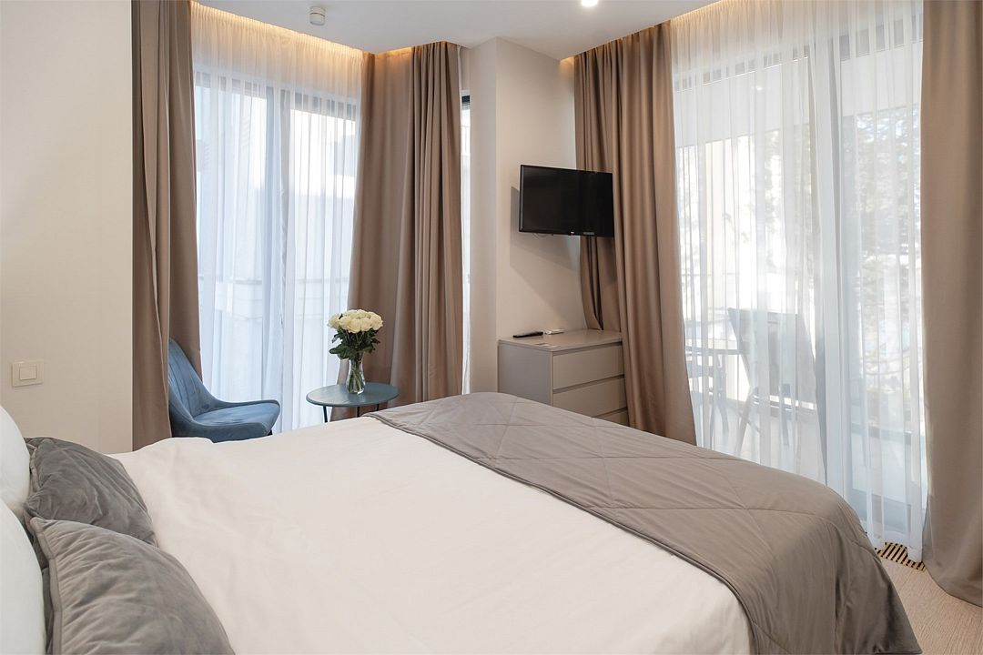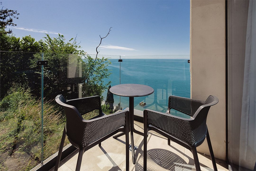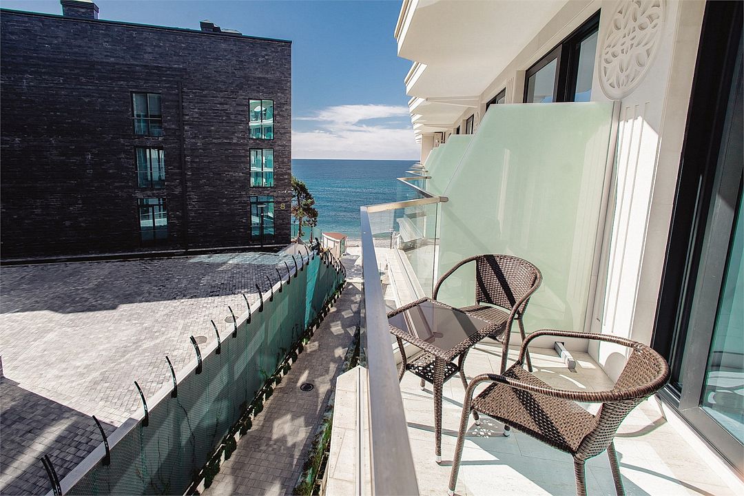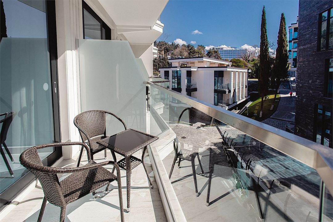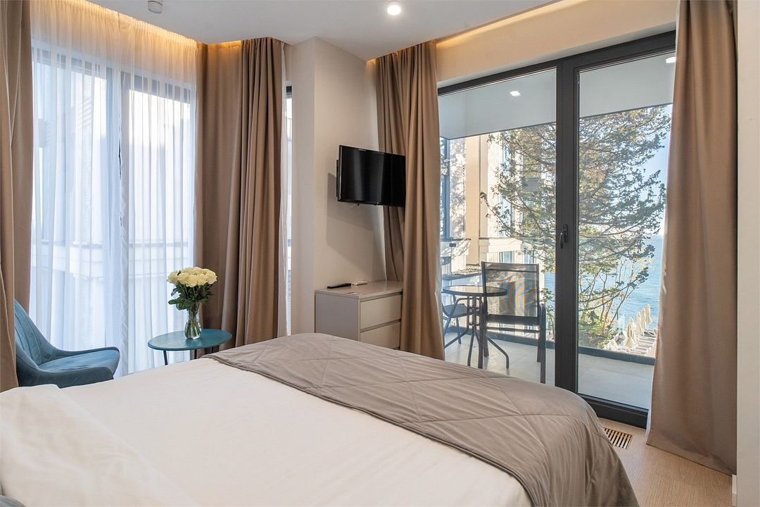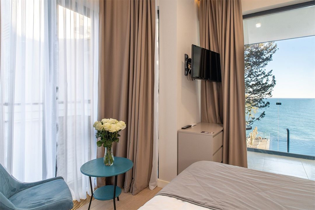 Стильные однокомнатные апартаменты площадью 21 м² отличаются современным и эргономичным дизайном. Панорамные окна и балкон с боковым видом на море создают неповторимую атмосферу, позволяя в полной мере насладиться отдыхом на побережье. Номера располагаются в главном корпусе на втором этаже и выше, а также в новом корпусе номер четыре.